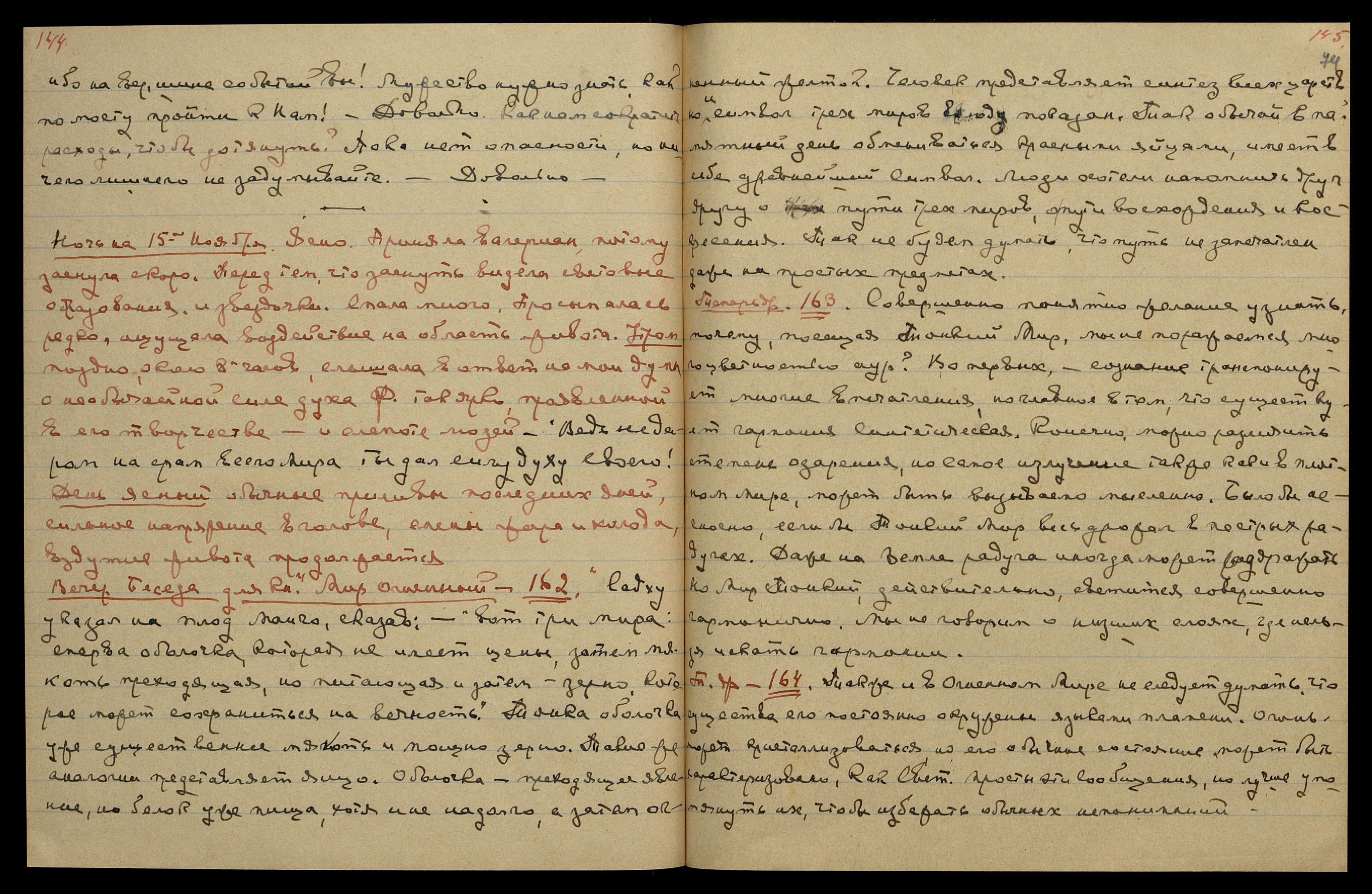 Ночь на 15-ое Ноября. Ясно. Приняла валериан, потому заснула скоро. Перед тем, что заснуть, видела световые образования и звёздочки. Спала много. Просыпалась редко, ощущала воздействие на область живота. Утром поздно, около 8 часов, слышала в ответ на мои думы о необычайной силе духа Ф[уямы], так ярко проявленной в его творчестве, и слепоте людей. "Ведь не даром на срам всего Мира ты дал силу духа своего!".