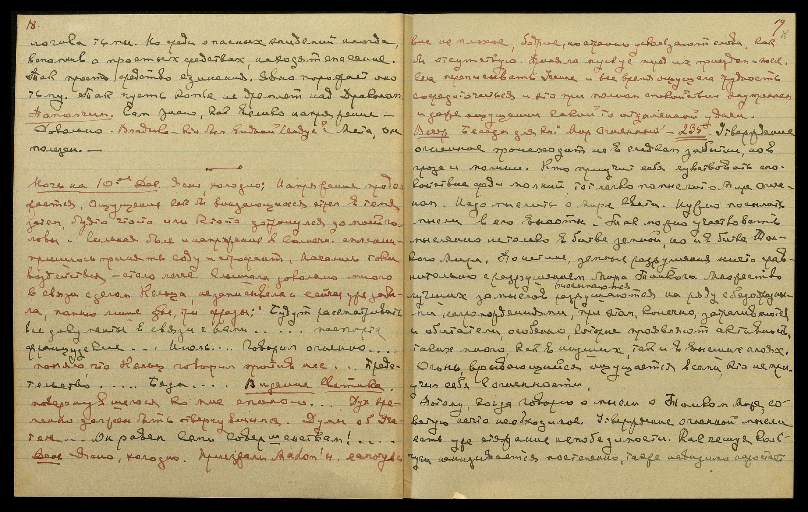 Ночь на 9-ое дек. Ясно, холоднее значительно. Сравнительно скоро уснула. Часто просыпалась, причем просыпалась застывшая, но затем теплая волна согревала изнутри все тело. Частые воздействия токов... "Пустили его, Господа!", —или, — "Упустили его, Господа!". Очень сильно сказано, даже тембр голоса зазвучал... Как бы взрыв, сопровождавшийся красным светом, легкое содрогание в сердце, услышала, — "Он не может быть дураком... 32 тысячи заплатили"... Много усколь-