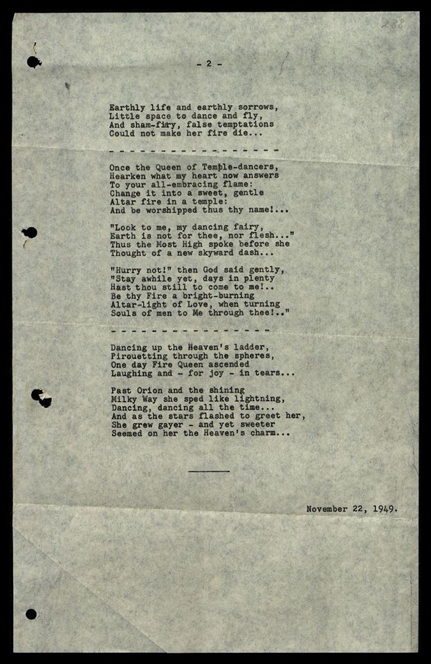 Об «Алом пламени» Е.И. Рерих писала В.Дудко: «Родная, знаете ли Вы, что я имею лишь вторую половину манускрипта «Алое Пламя»? Манускрипт начинается с 71-й страницы. Зина писала, что она читала весь манускрипт. Буду ожидать досылки первой части. «Маунтэн Рок» хранится у меня в полной целости» (16.10.1952).