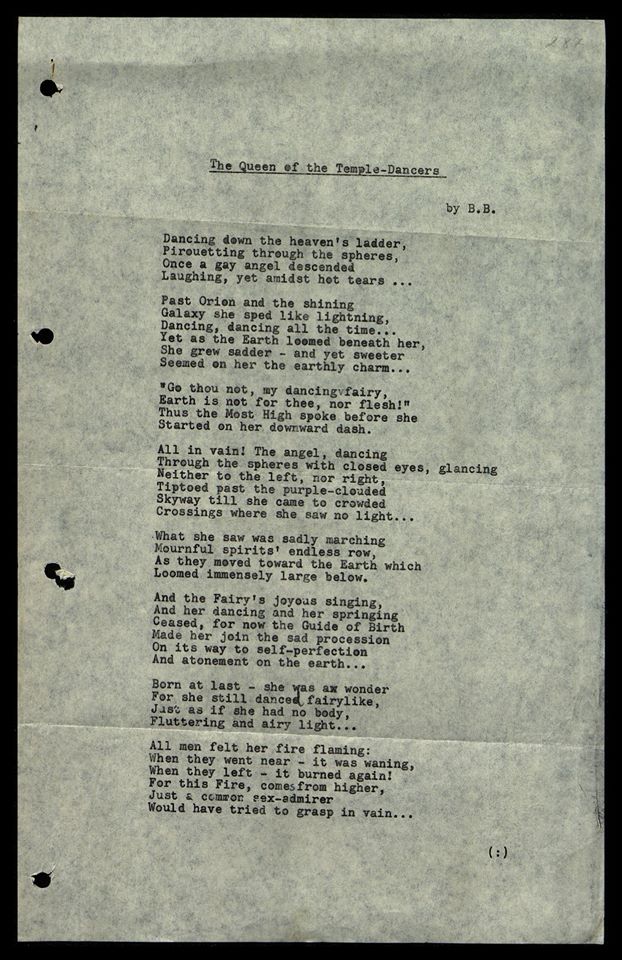 «…Интересно окружение Барны. Я хожу туда регулярно и совсем поражена. Я познакомилась с их «главной силой» - в автоматических записях его называют «Лама». Лама - скромнейший, простейший человек. Но под этой простоватой наружностью скрыта удивительная сила и способности «шестых чувств». Мне были показаны толстые манускрипты, написанные Ламой в трансе. Всевозможные материалы, удивительнейшие темы, совсем необычные сведенья, тибетские иероглифы, старинные записи Атланты, рисунки, музыкальные наброски древних рас, - все это простой, неученый, абсолютно некомпетентный в этих вопросах человек записал, не сознавая и не зная, что он пишет. Барна переводит записи на английский язык, его жена перепечатывает на машинке. Так распределена их работа. Сейчас им было указано, что я могу быть (единственный и первый в их жизни человек) допущена к их работе.