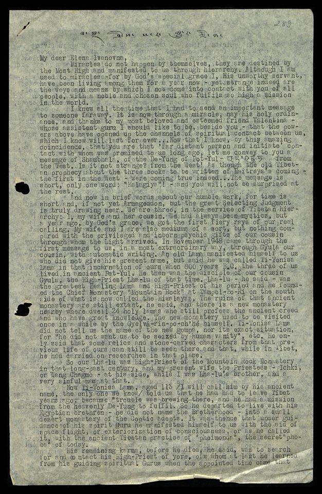 Я все время знал, что должен отослать важное сообщение кому-то, очень далекому. Именно сейчас, благодаря чуду, — нет, Его святому таинству, и благодаря моей самой любимой и уважаемой подруге Валентине, чьим гуру-помощником я хотел бы быть наряду с Вами, — Вышние силы открыли каналы духовного контакта между нами, который, я знаю, будет длиться вечно... Теперь, когда я знаю, по этому удивительному совпадению, что именно Вы тот "далекий человек и инициат", контакт с которым был обещан нам давным-давно, позвольте мне передать вам послание Шамбалы, Де-Юнг Пот-Юл (то же тибетским шрифтом — прим.ред) - с Запада. Не странно ли? С Запада! Словно древнее тибетское пророчество о трех книгах, которые должны быть написаны о пришествии Майтрейи - первая - на Западе, - сбылось... Послание кратко, одно лишь слово: "Калагия!" - и вас не удивит остальное.