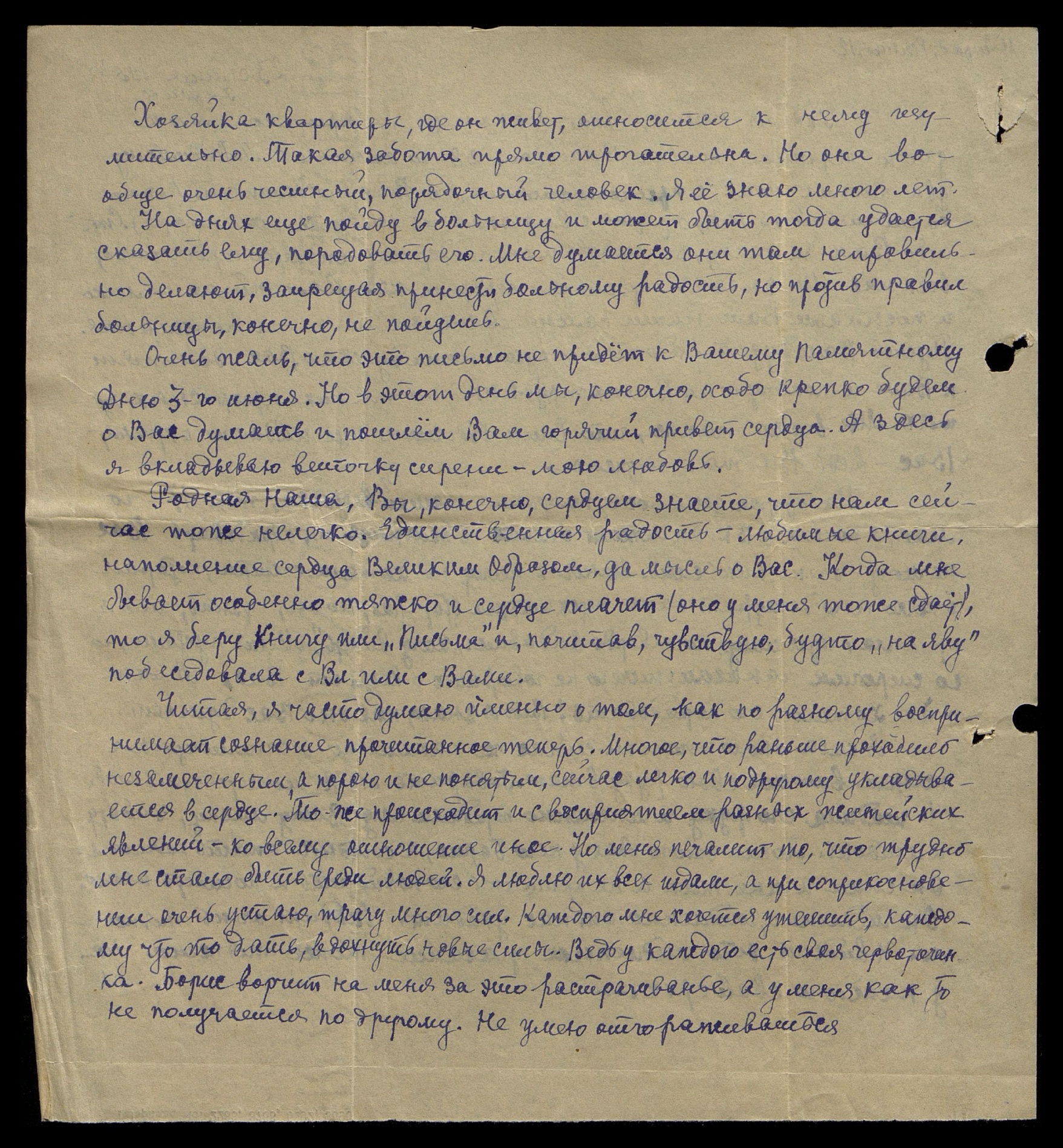 Задержала письмо отсылкой, в надежде, что может быть произойдет какое-то улучшение, изменение в состоянии здоровья дяди Володи. Была в больнице еще два раза и ходил Борис. Оба раза он спал и я лишь через полуоткрытую дверь на него посмотрела и мысленно ему передала привет. Он похудел очень. Вероятно о нас думает, т.к. Нина видела его во сне и у меня он побывал две ночи подряд. Тяжело ему бедненькому.