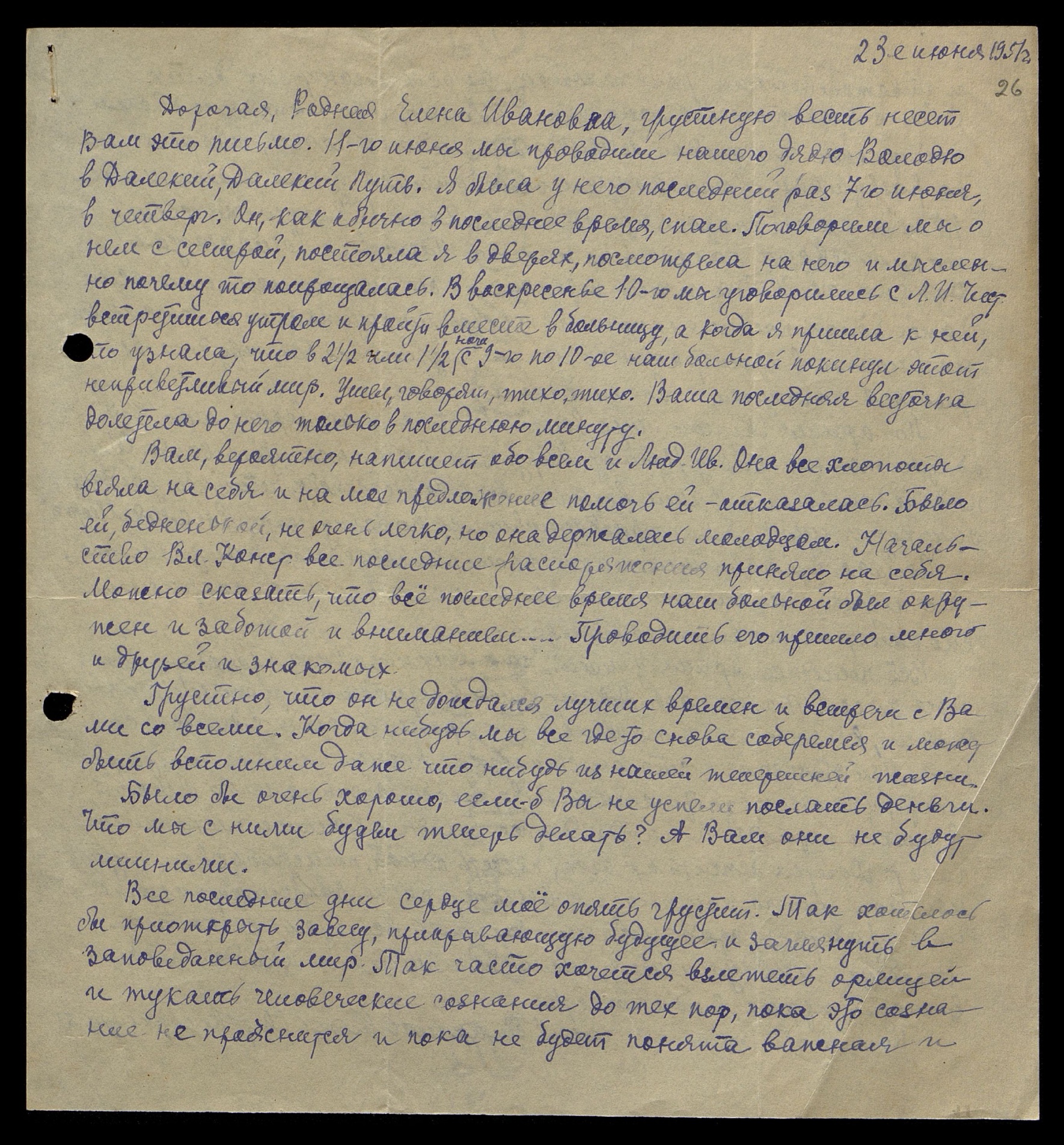 Дорогая, Родная Елена Ивановна, грустную весть несет Вам это письмо. 11-го июня мы проводили нашего дядю Володю в Далекий, Далекий Путь. Я была у него последний раз 7-го июня, в четверг. Он, как обычно в последнее время, спал. Поговорили мы о нем с сестрой, постояла я в дверях, посмотрела на него и мысленно почему-то попрощалась. В воскресенье 10-го мы договорились с Л. И. Чист. встретиться утром и пойти вместе в больницу, а когда я пришла к ней, то узнала, что в 2 ½ или 1 ½ ночи с 9-го по 10-е наш больной покинул этот неприветливый мир. Ушел, говорят, тихо, тихо. Ваша последняя весточка долетела до него только в последнюю минуту.