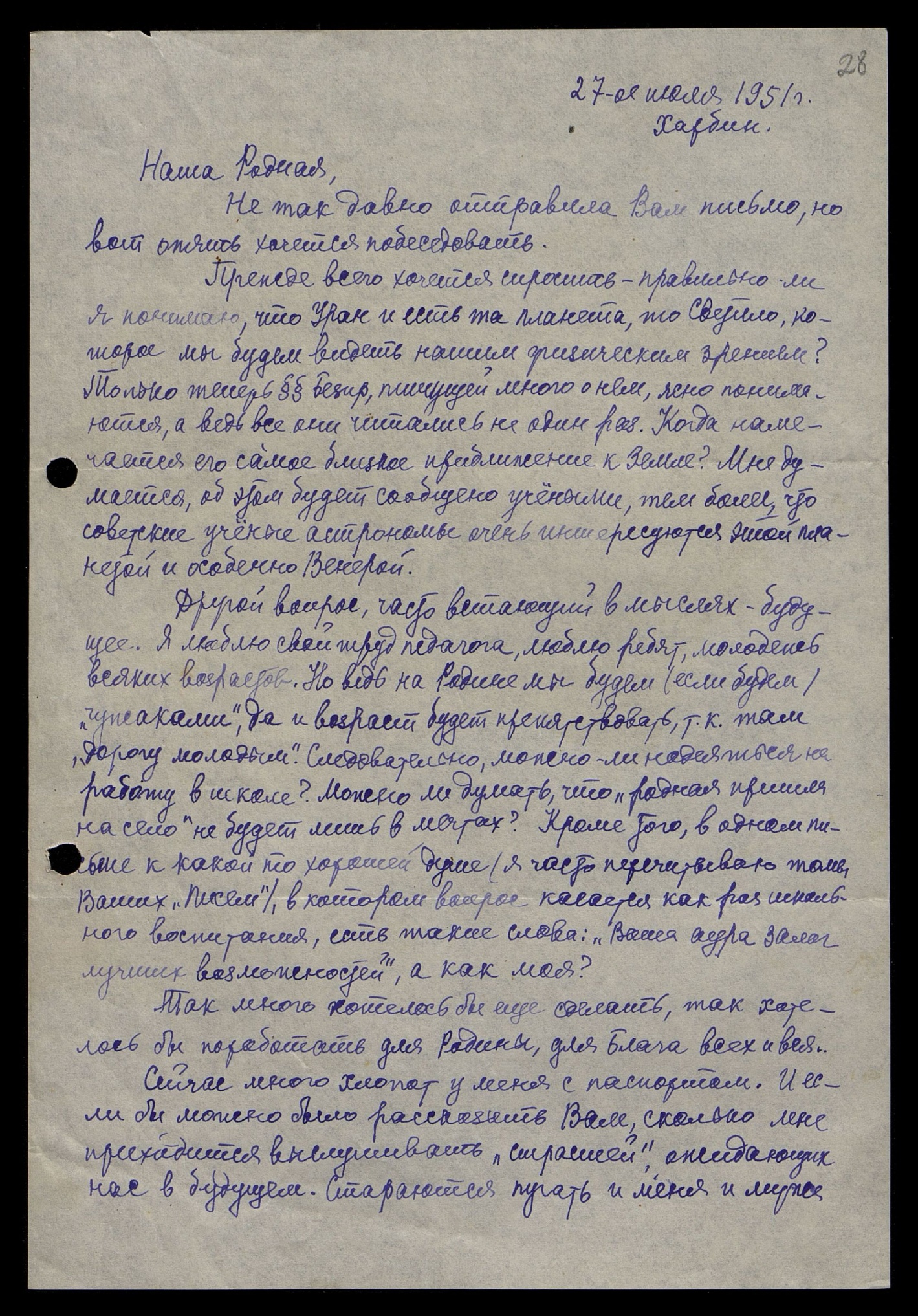 Другой вопрос, часто встающий в мыслях - будущее... Я люблю свой труд педагога, люблю ребят, молодежь всяких возрастов. Но ведь на Родине мы будем (если будем) "чужаками", да и возраст будет препятствовать, т.к. там "дорогу молодым". Следовательно, можно ли надеяться на работу в школе? Можно ли думать, что "родная пришла на село" не будет лишь в мечтах? Кроме того, в одном письме к какой-то хорошей душе (я часто перечитываю том Ваших "Писем"), в котором вопрос касается как раз школьного воспитания, есть такие слова: "Ваша аура залог лучших возможностей", а как моя?