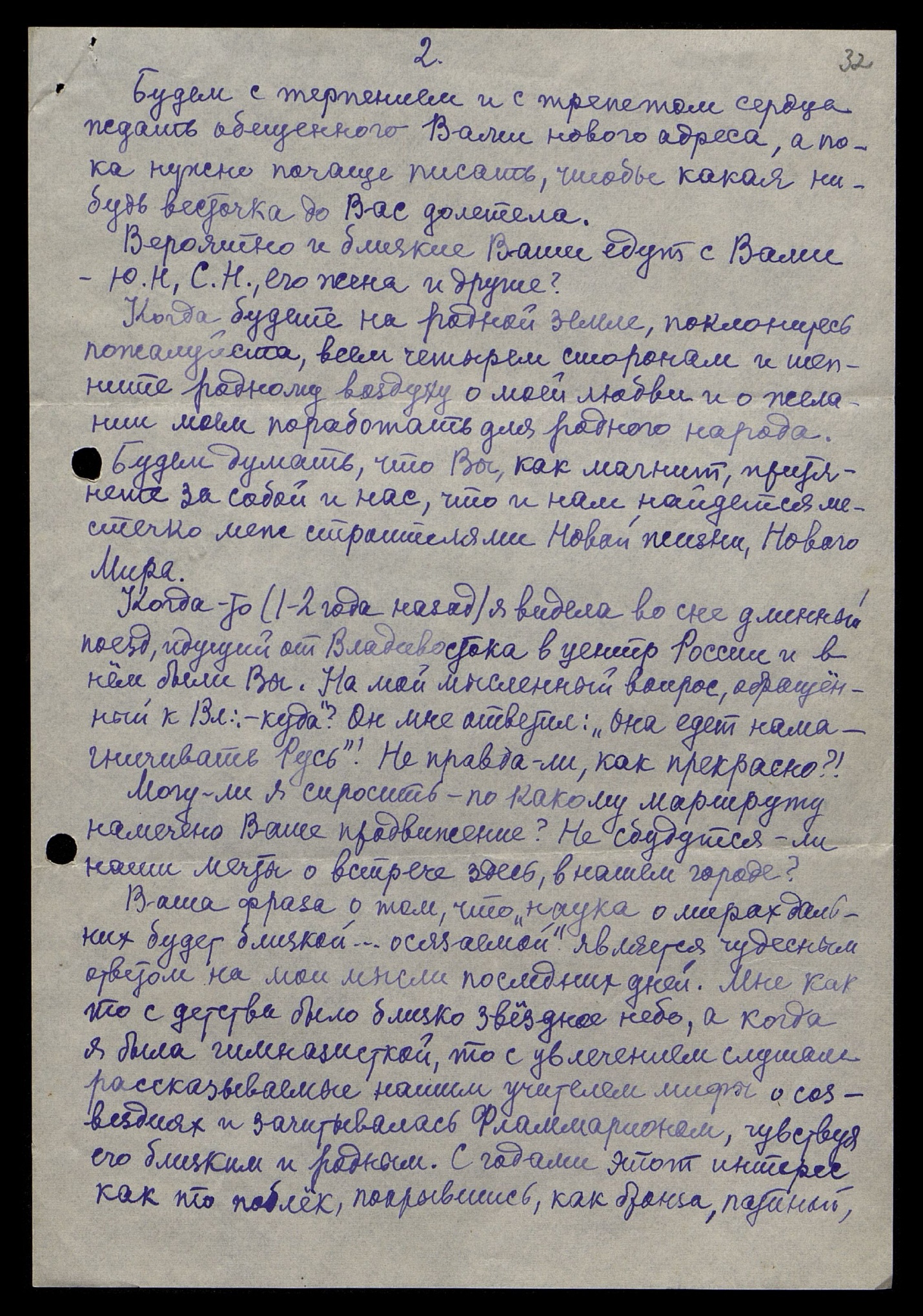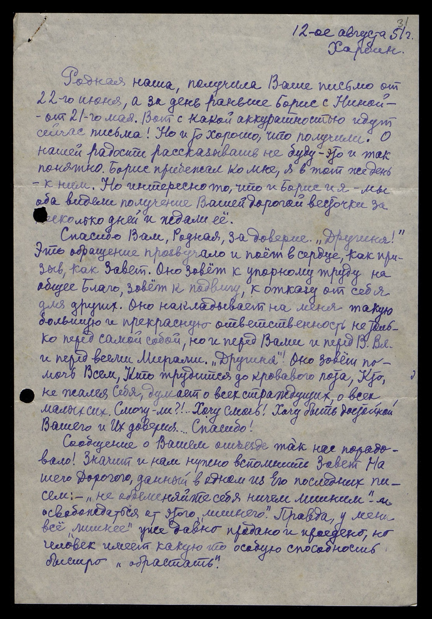 Родная наша, получила Ваше письмо от 22-го июня, а за день раньше Борис с Ниной - от 21-го мая. Вот с какой аккуратностью идут сейчас письма! Но и то хорошо, что получили. О нашей радости рассказывать не буду - это и так понятно. Борис прибежал ко мне, я в тот же день - к ним. Но интересно то, что и Борис, и я - мы оба видели получение Вашей дорогой весточки за несколько дней и ждали её.