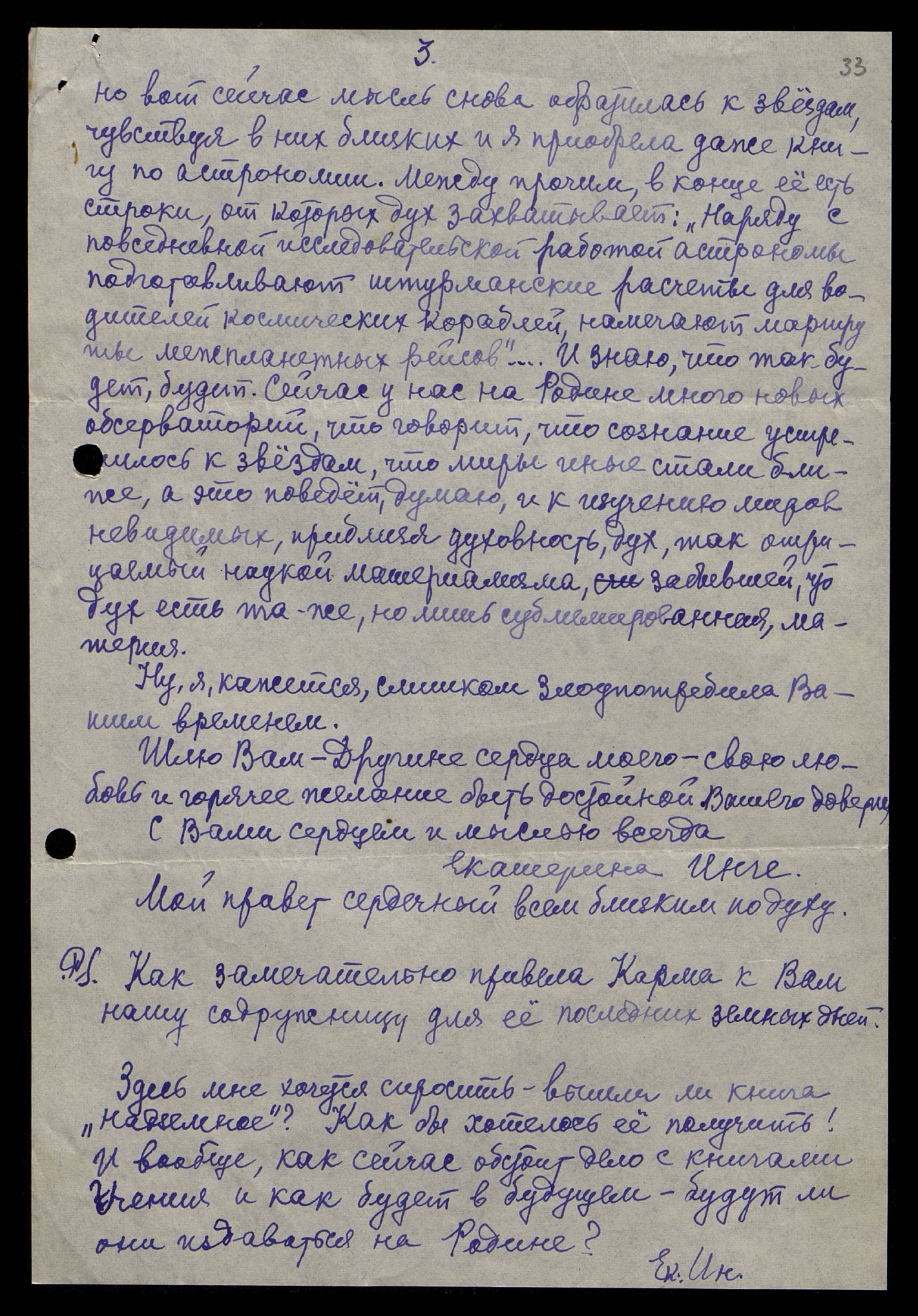 Читая, часто думаю с любовью и благодарностью о Нашем Дорогом, Светлом Друге − Учителе. Надеемся, что теперь скоро Его прекрасные Заветы будут входить в жизнь и быть может не за горами то время, когда мы прочтём Его Имя в журналах и газетах, когда услышим разные отзывы о Его трудах во имя лучшего будущего человечества.