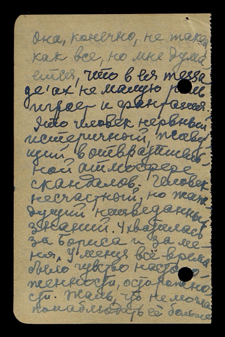 Она, конечно, не такая как все, но мне думается, что в ее message'ах не малую роль играет и фантазия. Это человек нервный, истеричный, живущий в отвратительной атмосфере скандалов. Человек несчастный, но жаждущий неизведанных знаний. Ухватилась за Бориса и за меня. У меня все время было чувство настороженности, осторожности. Жаль, что не могла понаблюдать её больше