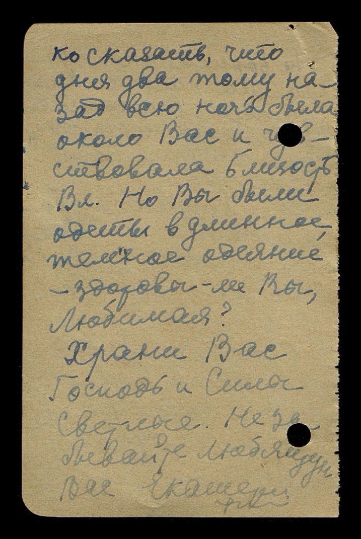 ко сказать, что дня два тому назад всю ночь была около Вас и чувствовала Близость Вл[адыки]. Но Вы были одеты в длинное, темное одеяние - здоровы ли Вы, Любимая?