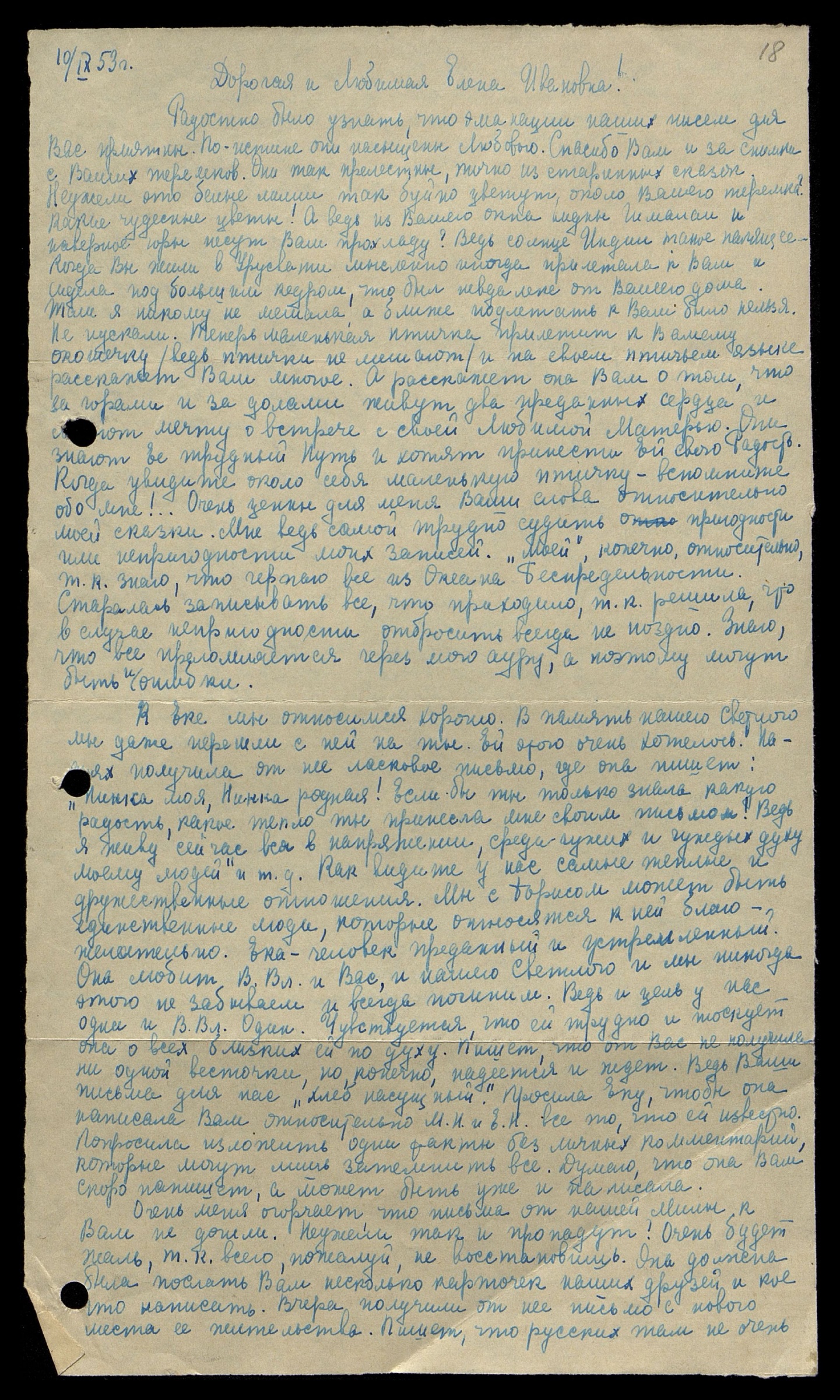 Наконец пришла от Вас такая долгожданная и желанная весточка. Сказать по правде, мы так истосковались о ней, и все время ждали от Вас письма. Радость большая для нас, когда получаем его. Ваши письма так насыщены, и от них так горячо на сердце. Спасибо, спасибо... В день получения телеграммы мы сейчас же послали Вам письмо по Авиа, через несколько дней опять послала опять письмо и после него посылали все время и by air mail и простые, и 8 февр[аля] express в надежде, что, может быть, оно скорее дойдет. Возможно, что постепенно наши письма все же дойдут. В каждом из них мы шлем Вам свою любовь и хочется, чтобы они все дошли и принесли Вам радость. Письмо Ваше от 17/XI мы получили. Оно очень ценно для нас по своей глубине. Мы с Борисом его вместе читали и обсуждали. У нас возникло много вопросов, и мы, подумав, решили, что не следует обременять Вас излишними вопросами, т.к. понимаем, насколько бывает трудно отвечать на многое.