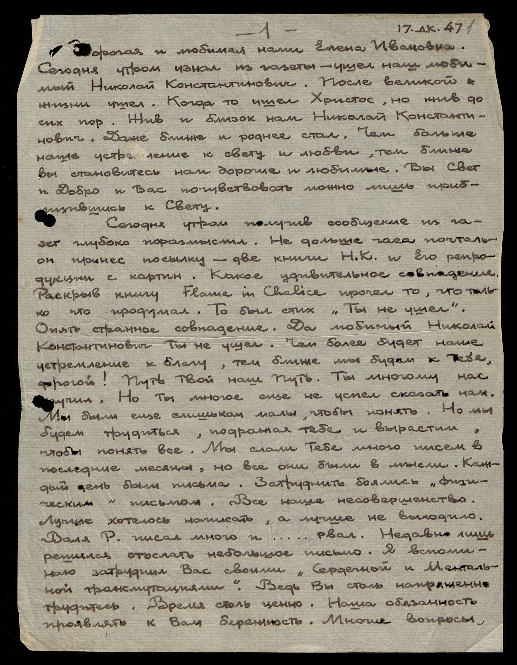 Дорогая и любимая нами Елена Ивановна. Сегодня утром узнал из газеты − ушел наш любимый Николай Константинович. После великой жизни ушел. Когда-то ушел Христос, но жив до сих пор. Жив и близок нам Николай Константинович. Даже ближе и роднее стал. Чем больше наше устремление к свету и любви, тем ближе вы становитесь нам, дорогие и любимые. Вы Свет и Добро, и Вас почувствовать можно лишь приблизившись к Свету.
