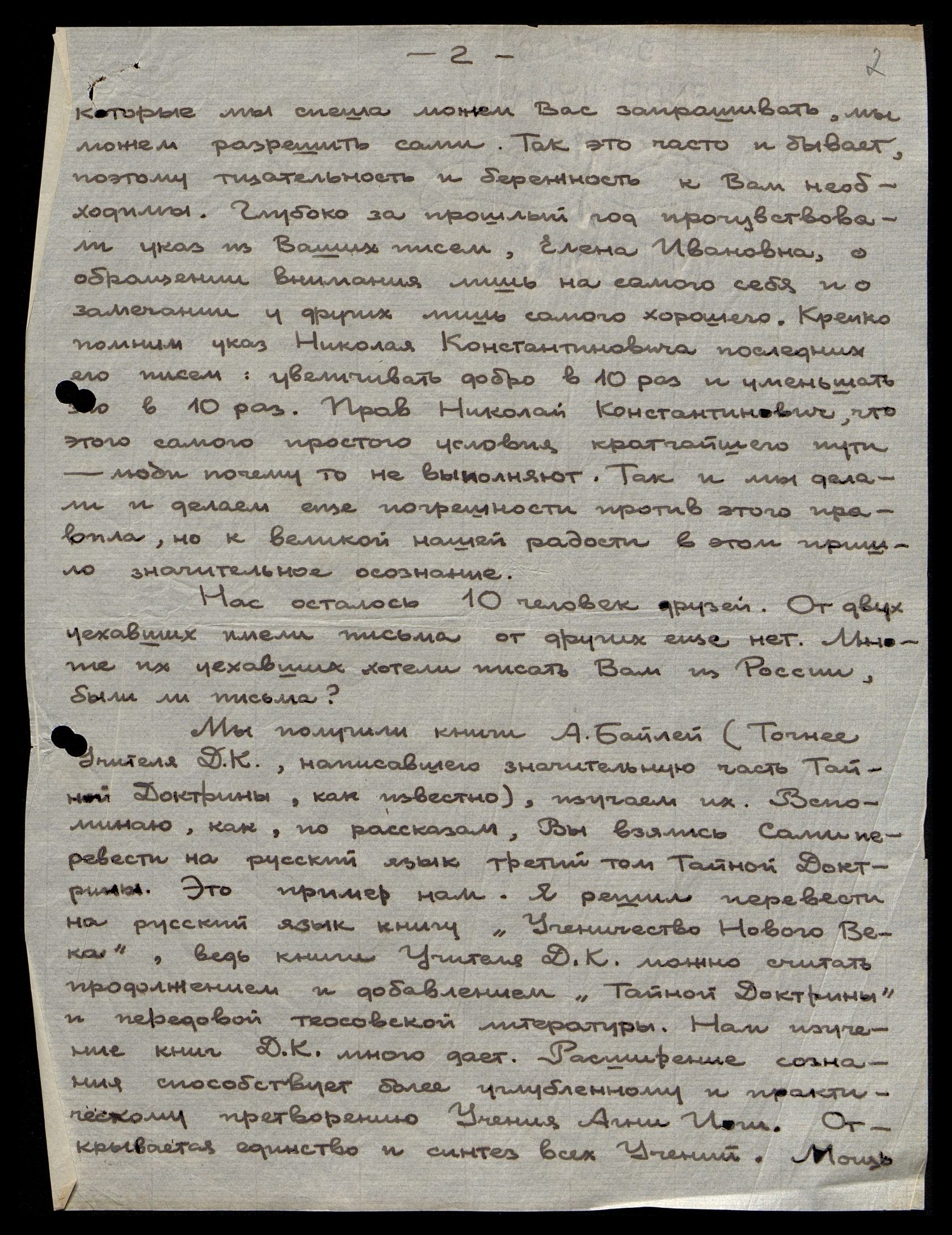 Мы получили книги А. Бейли* (Точнее, Учителя Д[жуал] К[хул], написавшего значительную часть "Тайной Доктрины", как известно**), изучаем их. Вспоминаю, как, по рассказам, Вы взялись Сами перевести на русский язык третий том "Тайной Доктрины"***. Это пример нам. Я решил перевести на русский язык книгу "Ученичество Нового Века", ведь книги Учителя Д.К. можно считать продолжением и добавлением "Тайной Доктрины" и передовой теософской литературы. Нам изучение книг Д.К. много дает. Расширение сознания способствует более углубленному и практическому претворению Учения Агни Йоги. Открывается единство и синтез всех Учений. Мощь