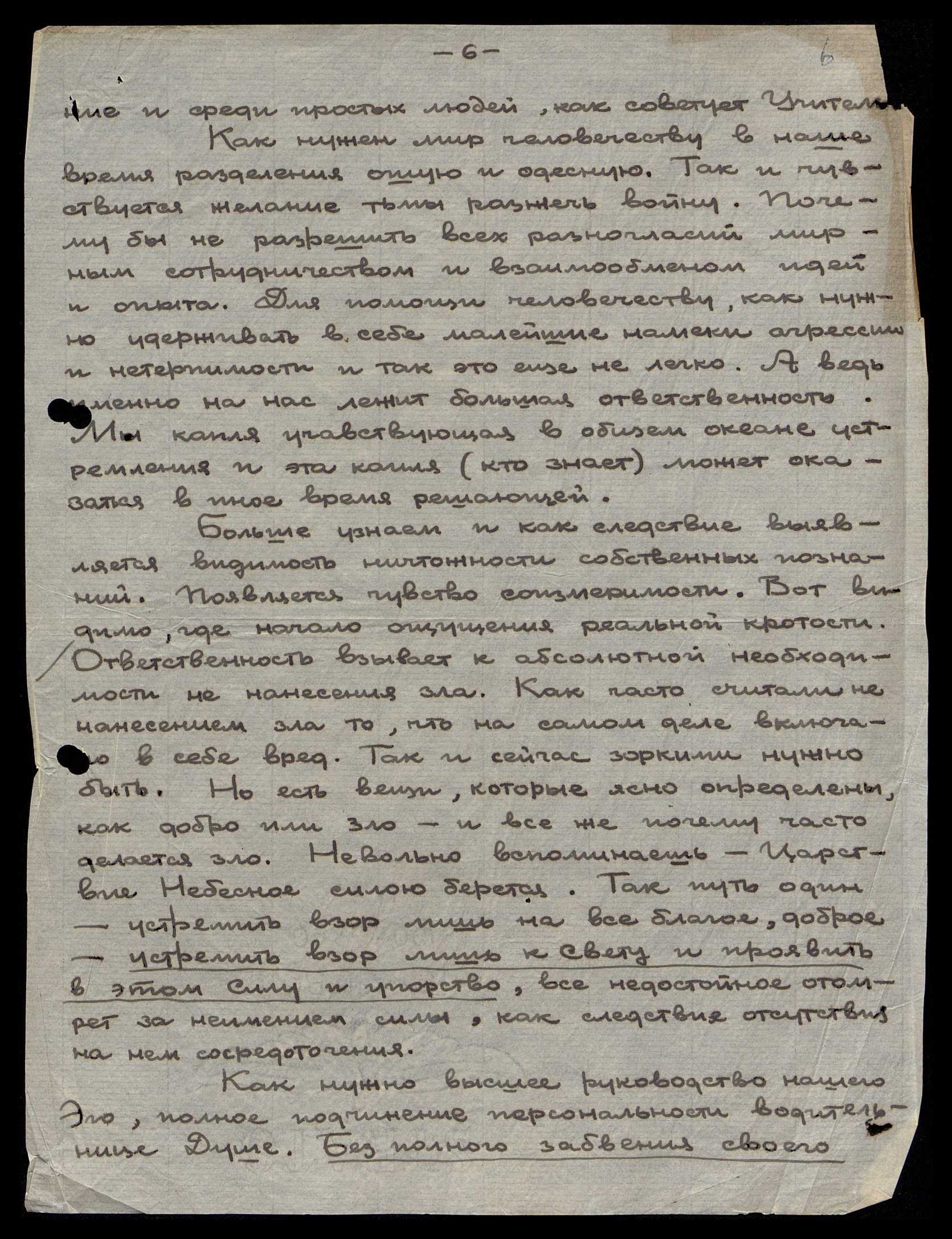 Да, забыть свое я; лишь общее благо всегда иметь в виду; раствориться в правильном труде на помощь Иерархии в проведении [одно слово нечитаемо] Плана. Для этого не нужно перемен мест, условий. (Конечно это не значит, что не нужно переездов и т.п., но они д[олжны] б[ыть] естественны, как результат труда добротворчества, а не как результат подсознательного чувства недовольства якобы неподходящими условиями, страха за существование и т.п.) Наши условия, в которые нас ставит жизнь нам самые подходящие. Прав Николай Константинович, он писал нам: кто знает, где вы будете нужнее.