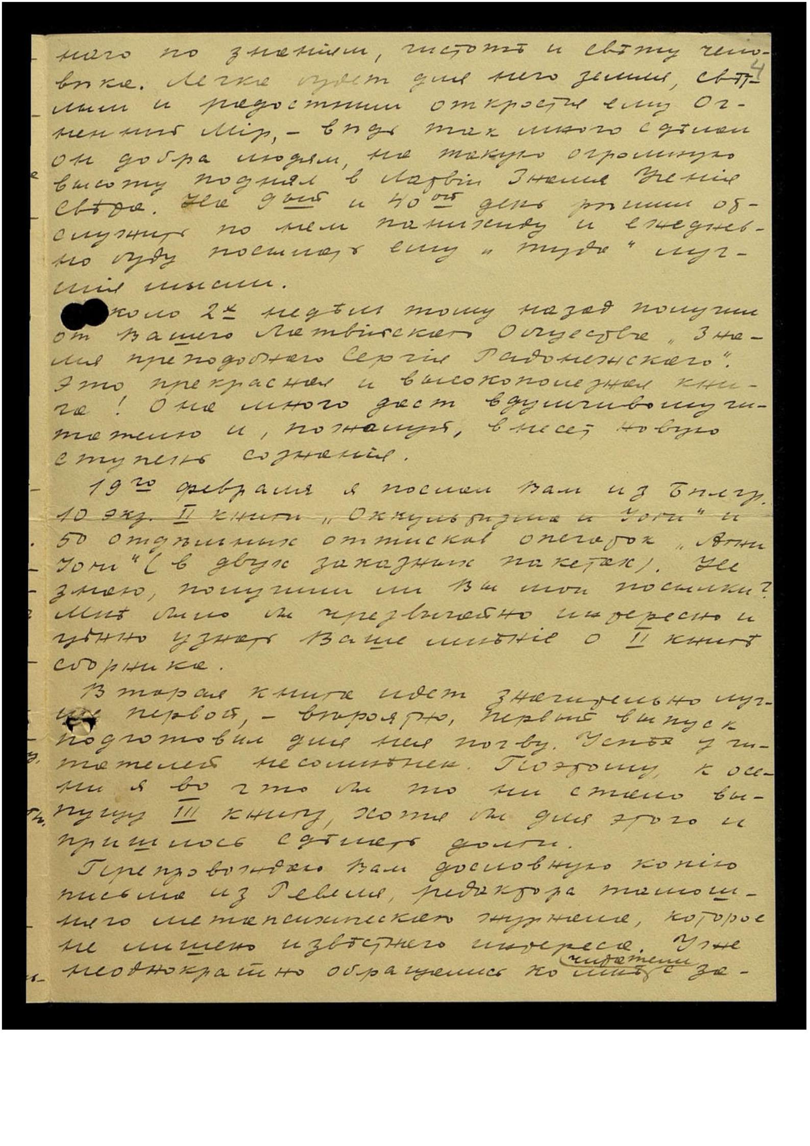Вы спрашивали, какие имеются у меня книги Учения и любезно предлагаете прислать мне недостающие. Я имею "Зов", "Озарение", "Агни Йогу" (на русском, французском и латышском яз[ыках]), "Беспредельность" (оба тома), "Иерархию", "Сердце" и "Мир Огненный" (I том). Последние две книги были мне присланы Г.Г. Шклявером в 5 экземплярах каждая, из кот[орых] по одному томику я оставил себе, а остальные раздарил своим друзьям. Имеются у меня также "Криптограммы Востока" (на русс[ком]