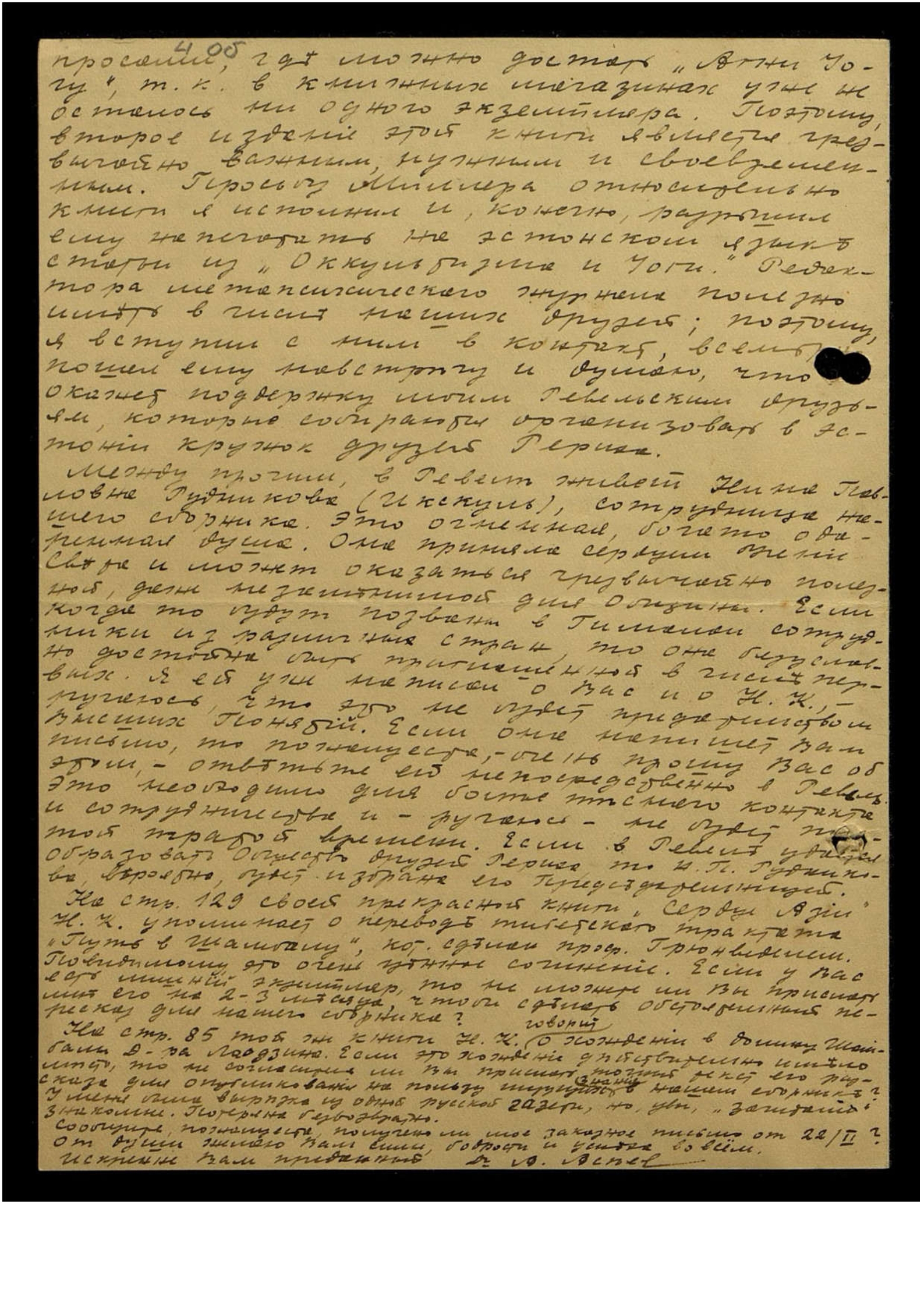 просами, где можно достать "Агни Йогу", т[ак] к[ак] в книжных магазинах уже не осталось ни одного экземпляра. Поэтому, второе издание этой книги является чрезвычайно важным, нужным и своевременным. Просьбу Миллера относительно книги я исполнил и, конечно, разрешил ему напечатать на эстонском языке статьи из "Оккультизма и Йоги". Редактора метапсихического журнала полезно иметь в числе наших друзей; поэтому, я вступил с ним в контакт, всемерно пошёл ему навстречу и думаю, что он окажет поддержку моим ревельским друзьям, которые собираются организовать в Эстонии кружок друзей Рериха.