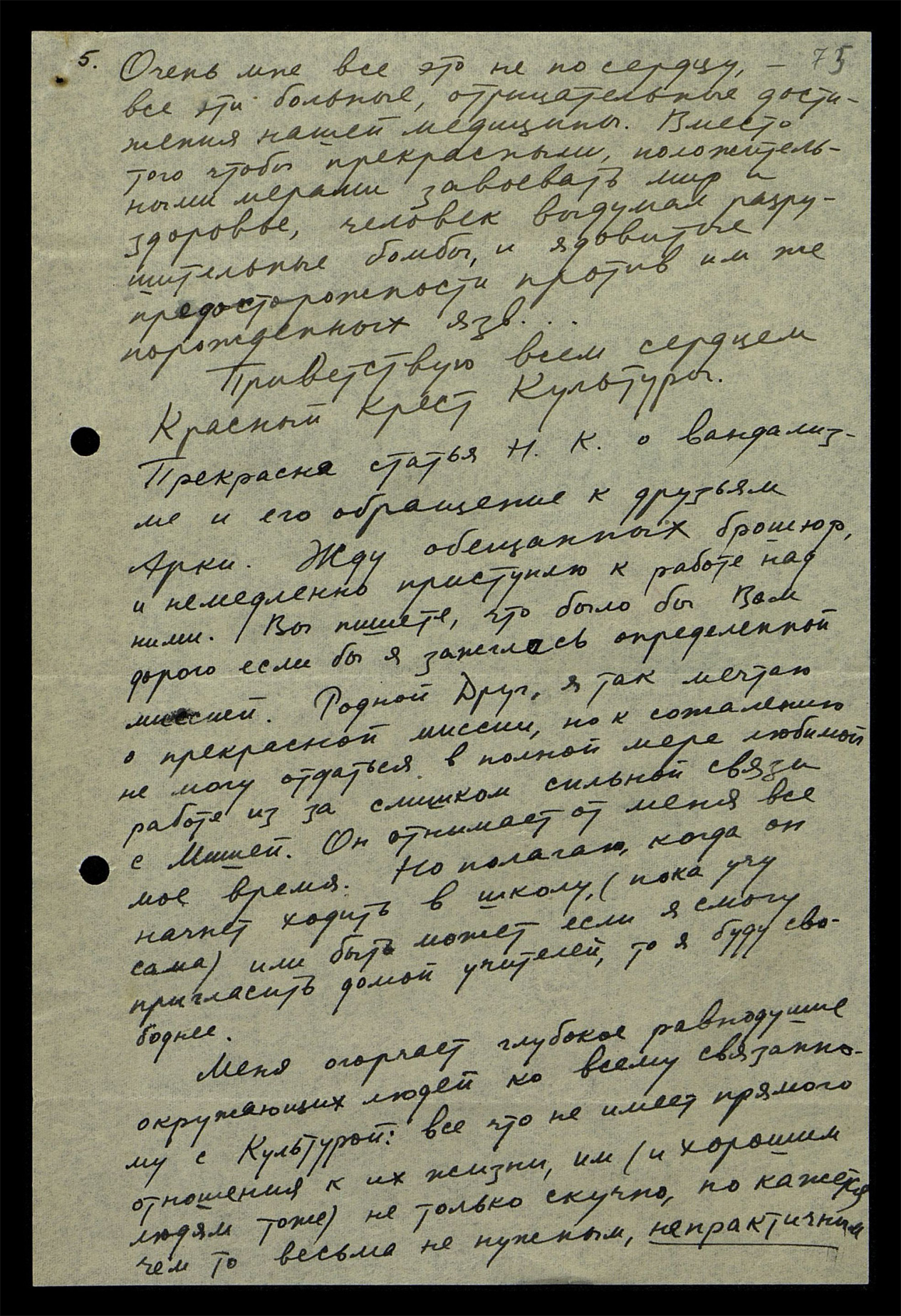 Приветствую всем сердцем "Красный Крест Культуры". Прекрасная статья Н.К. о вандализме и его обращение к друзьям Арки. Жду обещанных брошюр и немедленно приступлю к работе над ними. Вы пишите, что было бы Вам дорого, если бы я зажглась определенной миссией. Родной Друг, я так мечтаю о прекрасной миссии, но, к сожалению, не могу отдаться в полной мере любимой работе из-за слишком сильной связи с Мишей. Он отнимает от меня все мое время. Но полагаю, когда он начнет ходить в школу, (пока учу сама) или быть может, если я смогу пригласить домой учителей, то я буду свободнее.
