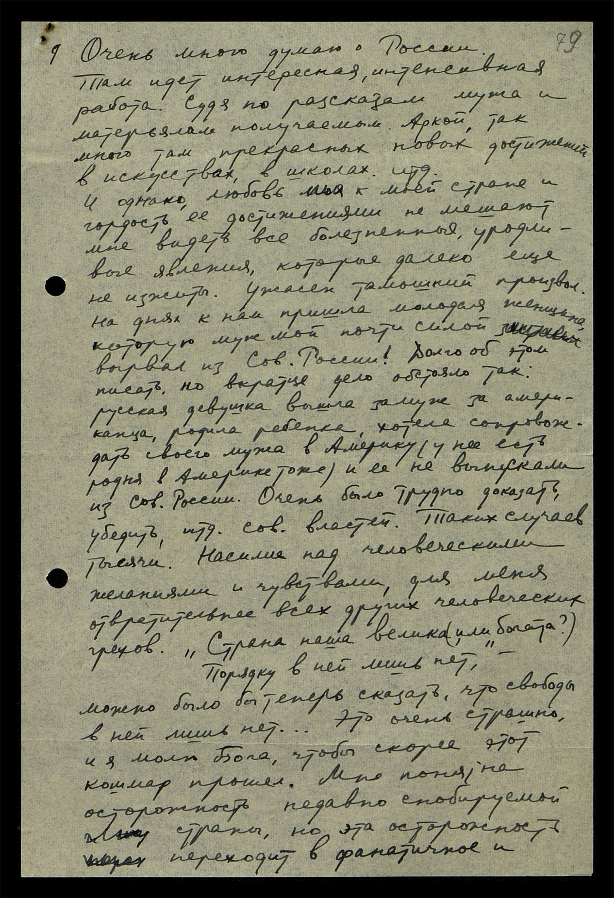 Очень много думаю о России. Там идет интересная, интенсивная работа. Судя по рассказам мужа и материалам получаемым Аркой, так много там прекрасных новых достижений в искусствах, в школах и т.д. И, однако, любовь моя к моей стране и гордость ее достижениями не мешают мне видеть все болезненные, уродливые явления, которые далеко еще не изжиты. Ужасен тамошний произвол. На днях к нам пришла молодая женщина, которую муж мой почти силой вырвал из Советской России! Долго об этом писать, но вкратце дело обстояло так: русская девушка вышла замуж за американца, родила ребенка, хотела сопровождать своего мужа в Америку (у нее есть родня в Америке тоже), и ее не выпускали из Советской России. Очень было трудно доказать, убедить и т.д. советские власти. Таких случаев тысячи. Насилие над человеческими желаниями и чувствами для меня отвратительнее всех других человеческих грехов. "Страна наша велика (или богата?), порядку в ней лишь нет"*, — можно было бы теперь сказать, что свободы в ней лишь нет... Это очень страшно, и я молю Бога, чтобы скорее этот кошмар прошел. Мне понятна осторожность недавно снобируемой страны, но эта осторожность переходит в фанатичное и