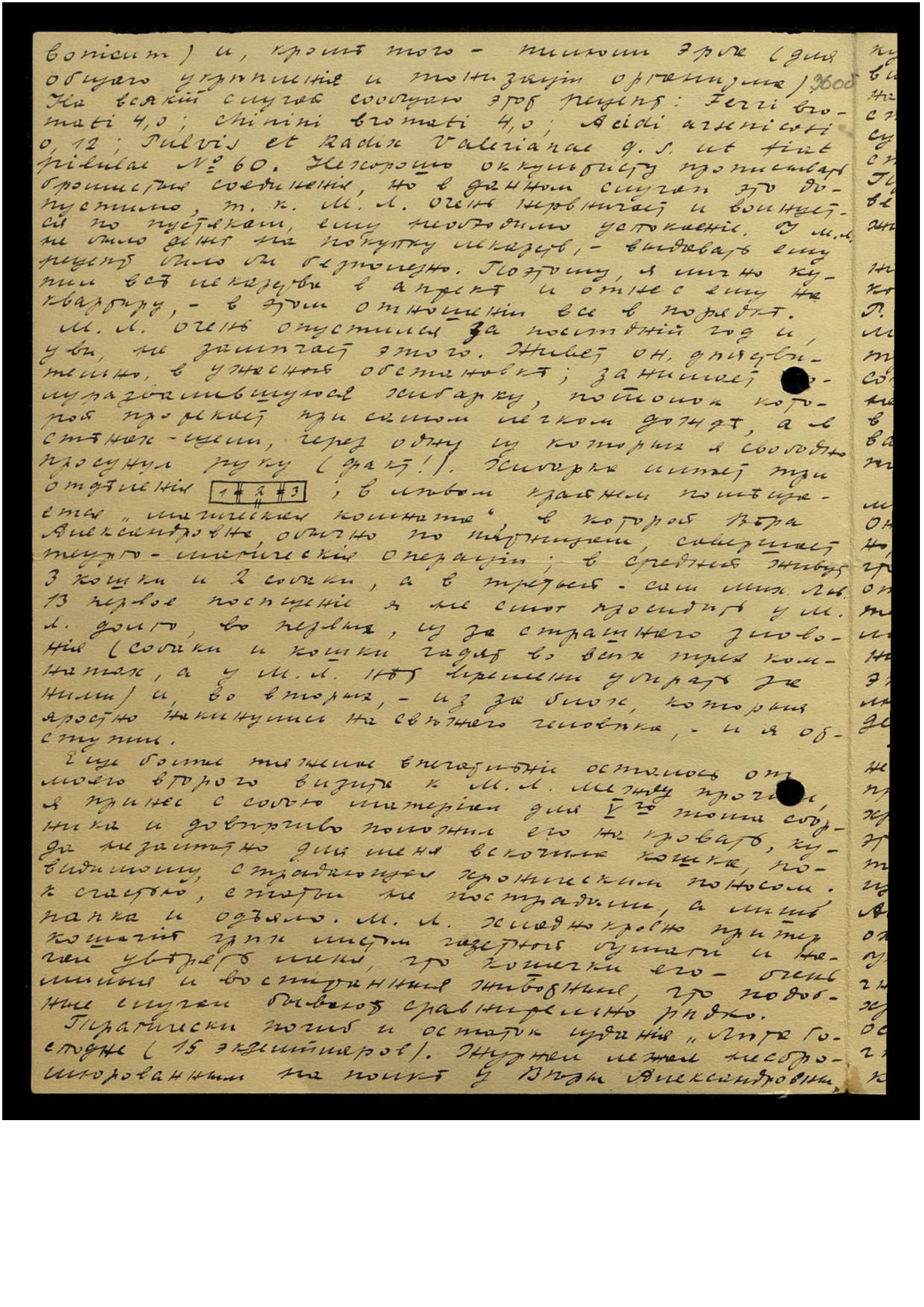 На всякий случай сообщаю этот рецепт: Ferri bromati 4,0; chinini bromati 4,0; Acidi arsenicosi 0,12; Pulvis et Radix Valerianis q.s. ut fiat pilulas № 60. Нехорошо оккультисту прописывать бромистые соединения, но в данном случае это допустимо, т[ак] к[ак] М[ихаил] Л[ьвович] очень нервничает и волнуется по пустякам, ему необходимо успокоение. У М[ихаила] Л[ьвовича] не было денег на покупку лекарств — выдавать ему рецепт было бесполезно. Поэтому, я лично купил все лекарства в аптеке и отнес ему на квартиру — в этом отношении всё в порядке.