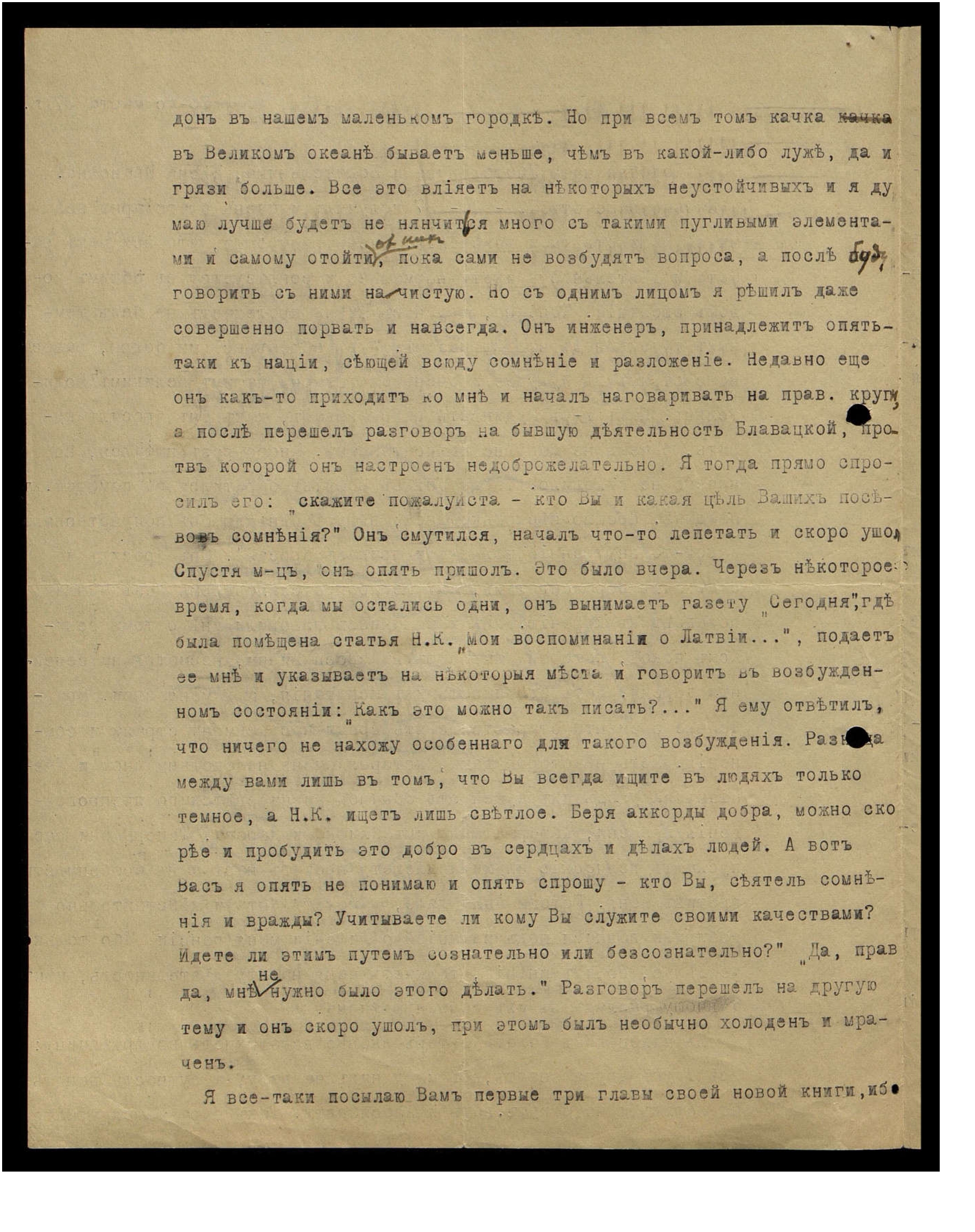 дон в нашем маленьком городке. Но при всем том качка в Великом океане бывает меньше, чем в какой-либо луже, да и грязи больше. Все это влияет на некоторых неустойчивых и я думаю лучше будет не нянчиться много с такими пугливыми элементами и самому отойти от них, пока сами не возбудят вопроса, а после буду говорить с ними начистую. Но с одним лицом я решил даже совершенно порвать и навсегда. Он инженер, принадлежит опять-таки к нации, сеющей всюду сомнение и разложение. Недавно еще он как-то приходит ко мне и начал наговаривать на православные круги, а после перешел разговор на бывшую деятельность Блаватской, против которой он настроен недоброжелательно. Я тогда прямо спросил его: "Скажите, пожалуйста, кто Вы и какая цель Ваших посевов сомнения?" Он смутился, начал что-то лепетать и скоро ушел. Спустя месяц он опять пришел. Это было вчера. Через некоторое время, когда мы остались одни, он вынимает газету "Сегодня", где была помещена статья Н.К. "Мои воспоминании о Латвии...", подает её мне и указывает на некоторые места и говорит в возбужденном состоянии: "Как это можно так писать?.." Я ему ответил, что ничего не нахожу особенного для такого возбуждения. Разница между вами лишь в том, что Вы всегда ищите в людях только темное, а Н.К. ищет лишь светлое. Беря аккорды добра, можно скорее и пробудить это добро в сердцах и делах людей. А вот Вас я опять не понимаю и опять спрошу: "Кто Вы, сеятель сомнения и вражды? Учитываете ли кому Вы служите своими качествами? Идете ли этим путем сознательно или бессознательно?" - "Да, прав да, мне не нужно было этого делать." Разговор перешел на другую тему и он скоро ушел, при этом был необычно холоден и мрачен.