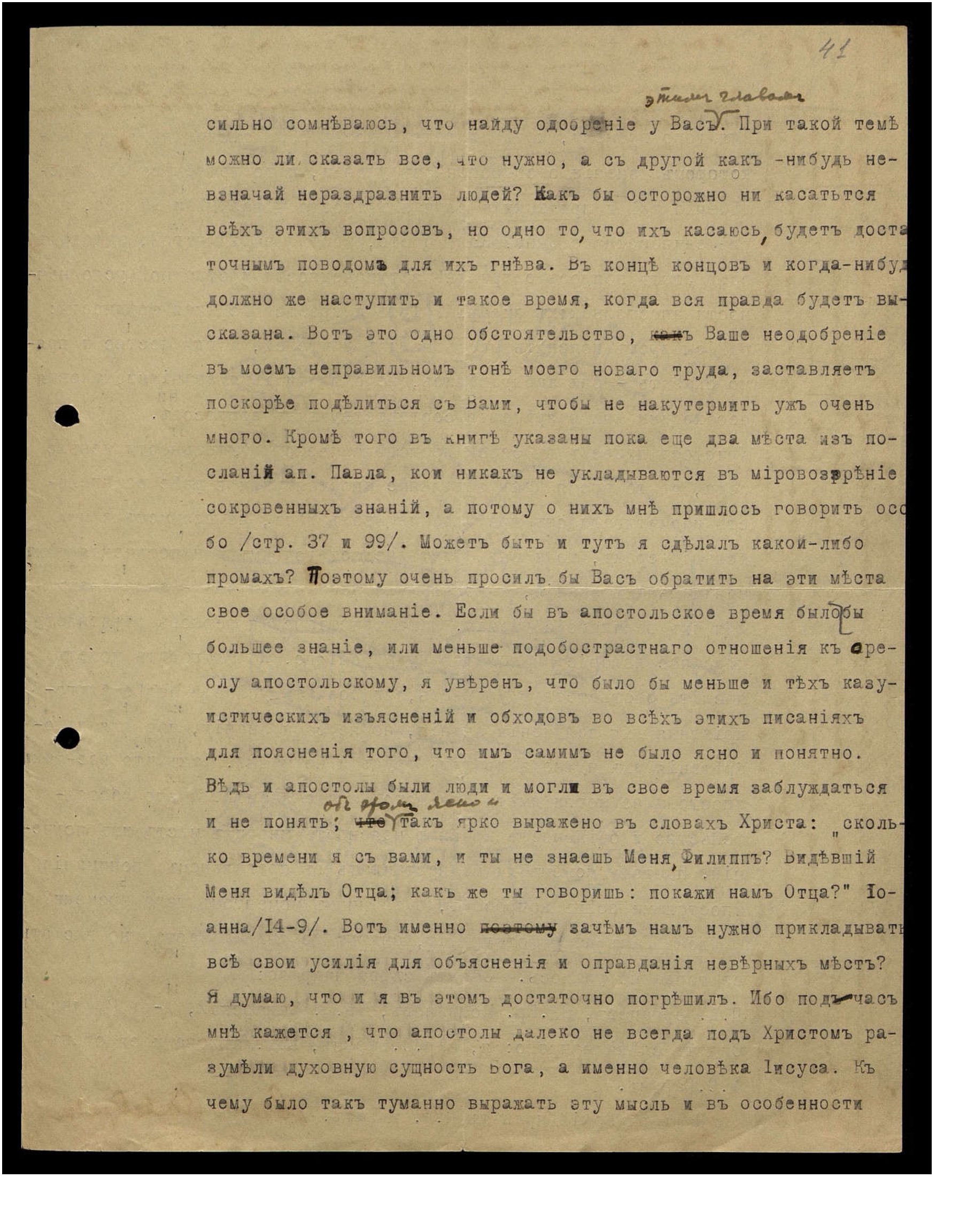 сильно сомневаюсь, что найду одобрение у Вас этим главам. При такой теме можно ли сказать все, что нужно, а с другой как-нибудь невзначай не раздразнить людей? Как бы осторожно ни касаться всех этих вопросов, но одно то, что их касаюсь будет достаточным поводом для их гнева. В конце концов и когда-нибудь должно же наступить и такое время, когда вся правда будет высказана. Вот это одно обстоятельство, Ваше неодобрение в моем неправильном тоне моего нового труда, заставляет поскорее поделиться с Вами, чтобы не накутермить уж очень много. Кроме того, в книге указаны пока еще два места из посланий ап. Павла, которые никак не укладываются в мировоззрение сокровенных знаний, а потому о них мне пришлось говорить особо (стр. 37 и 99). Может быть и тут я сделал какой-либо промах? Поэтому очень просил бы Вас обратить на эти места свое особое внимание. Если бы в апостольское время было бы большее знание, или меньше подобострастного отношения к ореолу апостольскому, я уверен, что было бы меньше и тех казуистических изъяснений и обходов во всех этих писаниях для пояснения того, что им самим не было ясно и понятно. Ведь и апостолы были люди и могли в свое время заблуждаться и не понять; об этом ясно и так ярко выражено в словах Христа: "Сколько времени я с вами, и ты не знаешь Меня, Филипп? Видевший Меня видел Отца; как же ты говоришь: покажи нам Отца?" (Иоанна, 14-9). Вот именно, зачем нам нужно прикладывать все свои усилия для объяснения и оправдания неверных мест? Я думаю, что и я в этом достаточно погрешил. Ибо подчас мне кажется, что апостолы далеко не всегда под Христом разумели духовную сущность Бога, а именно человека Иисуса. К чему было так туманно выражать эту мысль и в особенности
