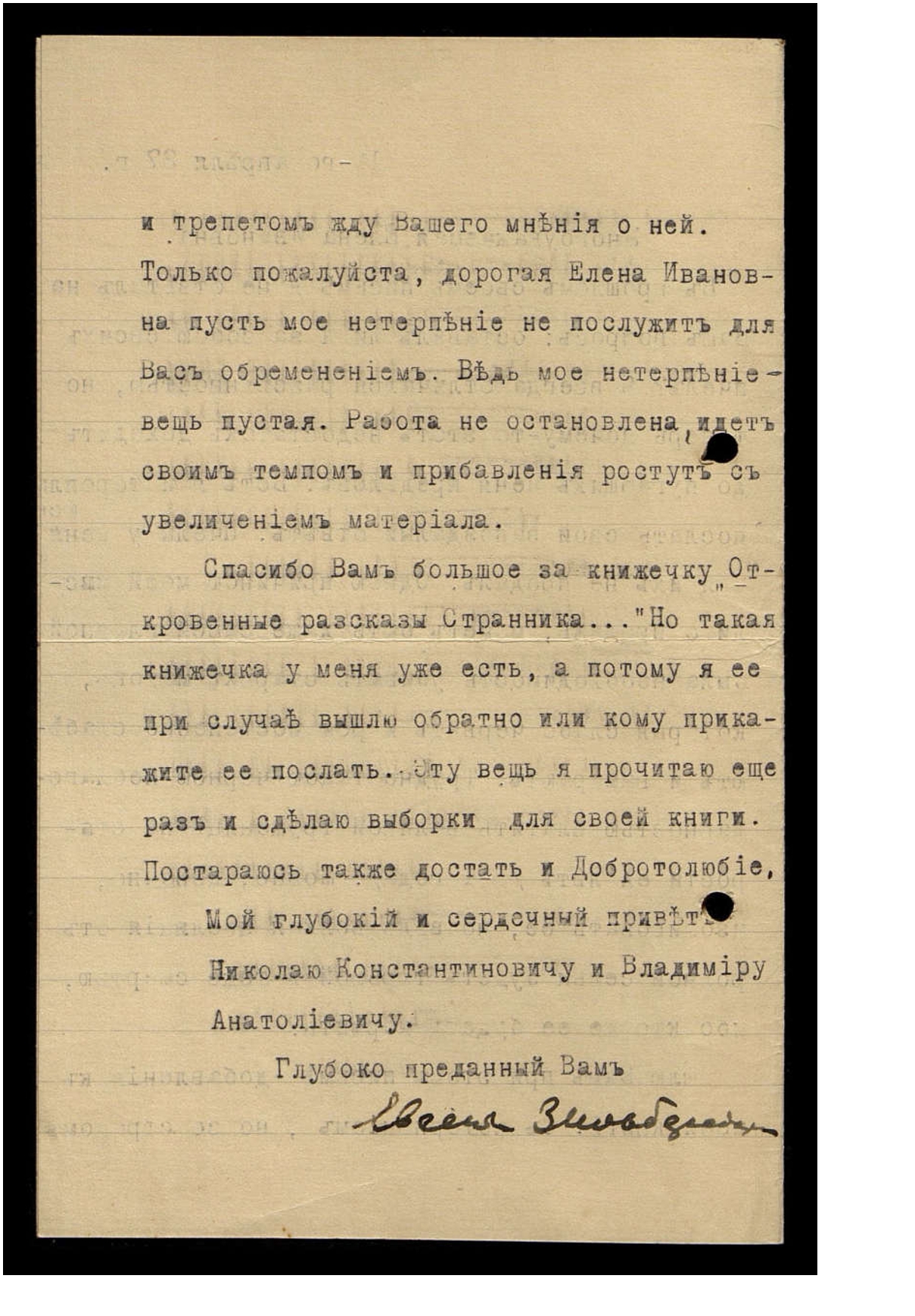Спасибо Вам большое за книжечку "Откровенные рассказы Странника..." Но такая книжечка у меня уже есть, а потому я её при случае вышлю обратно или кому прикажите её послать. Эту вещь я прочитаю еще раз и сделаю выборки для своей книги. Постараюсь также достать и Добротолюбие.