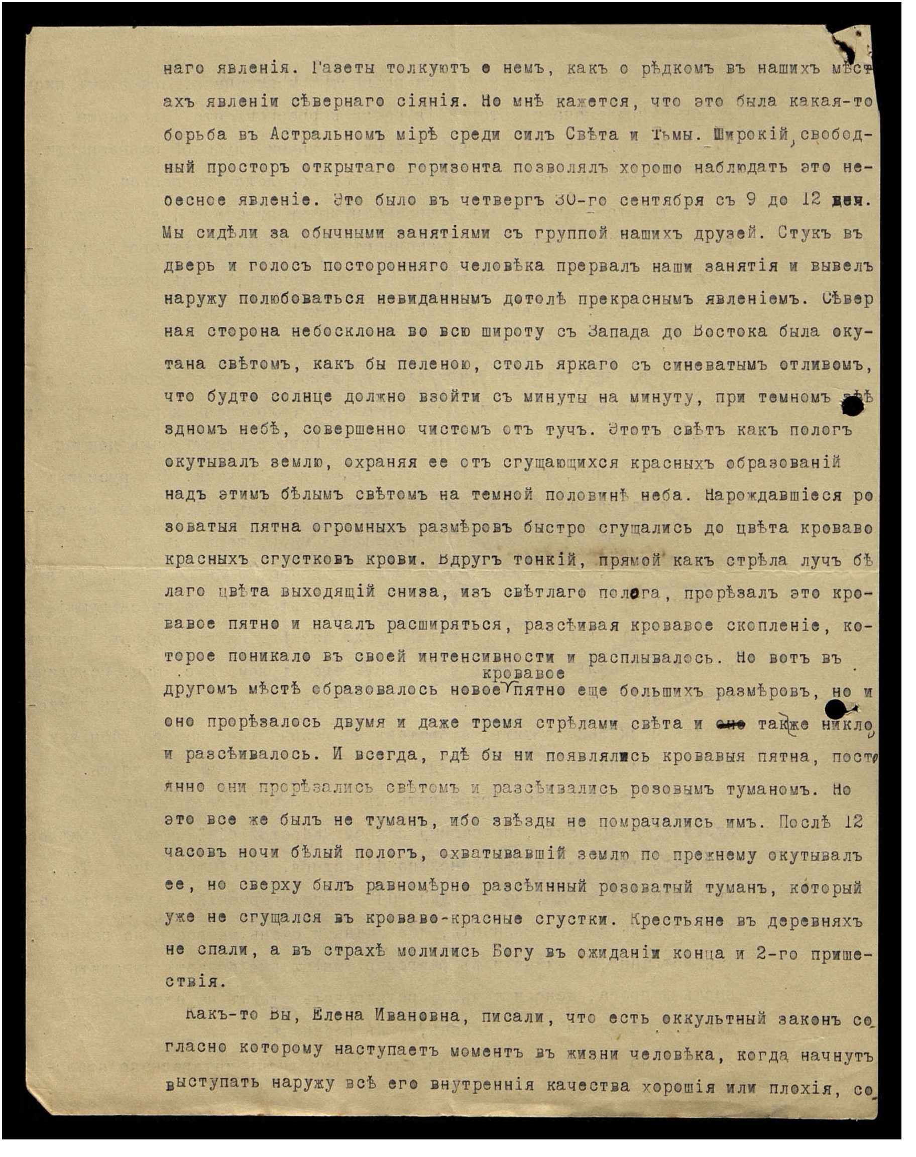 ного явления. Газеты толкуют о нем, как о редком в наших местах явлении северного сияния. Но мне кажется, что это была какая-то борьба в Астральном мире среди сил Света и Тьмы. Широкий, свободный простор открытого горизонта позволял хорошо наблюдать это небесное явление. Это было в четверг 30-го сентября с 9 до 12 дня. Мы сидели за обычными занятиями с группой наших друзей. Стук в дверь и голос постороннего человека прервал наши занятия и вывел наружу полюбоваться невиданным дотоле прекрасным явлением. Северная сторона небосклона во всю широту с Запада до Востока была окутана светом, как бы пеленою, столь яркого с синеватым отливом, что будто солнце должно взойти с минуты на минуту, при темном звездном небе, совершенно чистом от туч. Этот свет как полог окутывал землю, охраняя ее от сгущающихся красных образований над этим белым светом на темной половине неба. Нарождавшиеся розоватые пятна огромных размеров быстро сгущались до цвета кроваво красных сгустков крови. Вдруг тонкий, прямой как стрела, луч белого цвета выходящий снизу, из светлого полога, прорезал это кровавое пятно и начал расширяться, рассеивая кровавое скопление, которое поникало в своей интенсивности и расплывалось. Но вот в другом месте образовалось новое кровавое пятно еще больших размеров, но и оно прорезалось двумя и даже тремя стрелами света и также никло и рассеивалось. И всегда, где бы ни появлялись кровавые пятна, постоянно они прорезались светом и рассеивались розовым туманом. Но это все же был не туман, ибо звезды не помрачались им. После 12 часов ночи белый полог, охватывавший землю по прежнему окутывал ее, но сверху был равномерно рассеянный розоватый туман, который уже не сгущался в кроваво-красные сгустки. Крестьяне в деревнях не спали, а в страхе молились Богу в ожидании конца и 2-го пришествия.