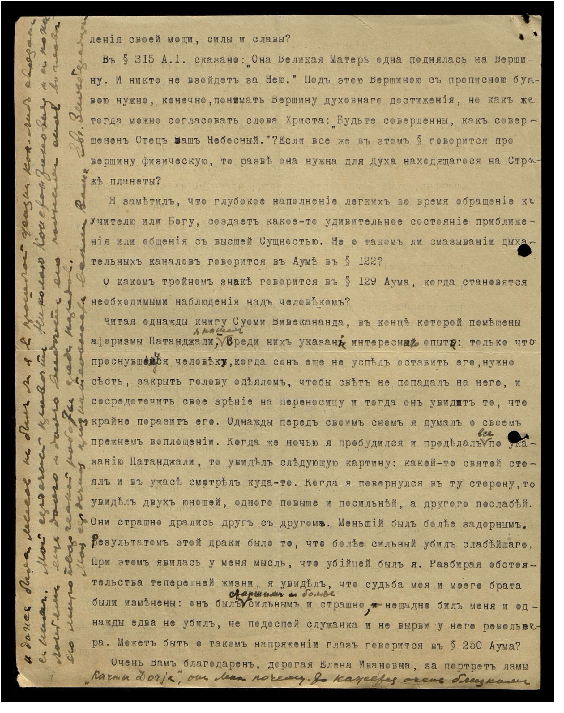 Читая однажды книгу Суоми Вивекананда, в конце которой помещены афоризмы Патанджали, я нашел среди них указание интересного опыта: только что проснувшемуся человеку, когда сон еще не успел оставить его, нужно сесть, закрыть голову одеялом, чтобы свет не попадал на него, и сосредоточить свое зрение на переносицу и тогда он увидит то, что крайне поразит его. Однажды перед своим сном я думал о своем прежнем воплощении. Когда же ночью я пробудился и проделал все по указанию Патанджали, то увидел следующую картину: какой-то святой стоял и в ужасе смотрел куда-то. Когда я повернулся в ту сторону, то увидел двух юношей, одного повыше и посильней, а другого послабей. Они страшно дрались друг с другом. Меньший был более задорным. Результатом этой драки было то, что более сильный убил слабейшего. При этом явилась у меня мысль, что убийцей был я. Разбирая обстоятельства теперешней жизни, я увидел, что судьба моя и моего брата были изменены: он был старшим и более сильным, и страшно нещадно бил меня и однажды едва не убил, не подоспей служанка и не вырви у него револьвера. Может быть о таком напряжении глаз говорится в § 250 Аума? Очень Вам благодарен, дорогая Елена Ивановна, за портрет ламы "Karma Dorje", он мне почему-то кажется очень близкими и даже была мысль, не был ли я в прошлой жизни как-либо связан с ним. Мой сердечный привет Николаю Константиновичу и с пожеланиями еще долго и долго видеть его полным сил во главе его миротворческой работе среди народов.