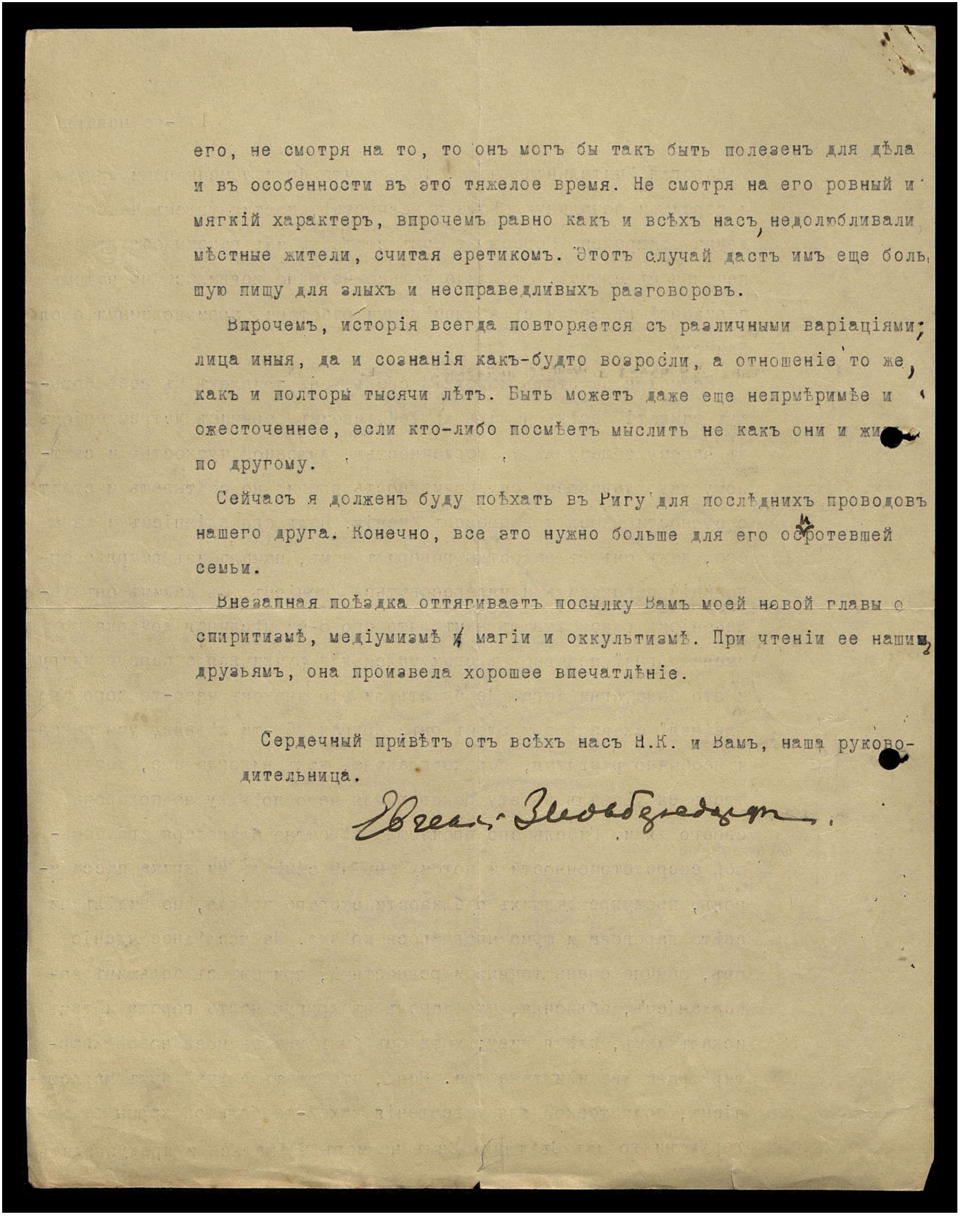 Но могу ли я в своей благодарности обойти и Вас, дорогая наша учительница? Тысячу раз нет! Сколько света, мягкости, чуткости пролито во всех Ваших мудрых посланиях достойных увековечивания в книге для многих и многих ищущих светлых путей! Спасибо Вам и Великому Владыке за милость и доверие! Всеми силами постараюсь оправдать выказанное великое доверие. Побывал в Риге уже два раза, но книги не получил, только от Клизовского узнал о великой чести. Но важна ведь не книга, а милость и доверие. Её же я имею, чего же больше? И без книги в нужную минуту Помощь придет, так что беспокоиться нечего. Мой сердечный привет Н.К. и Вам.