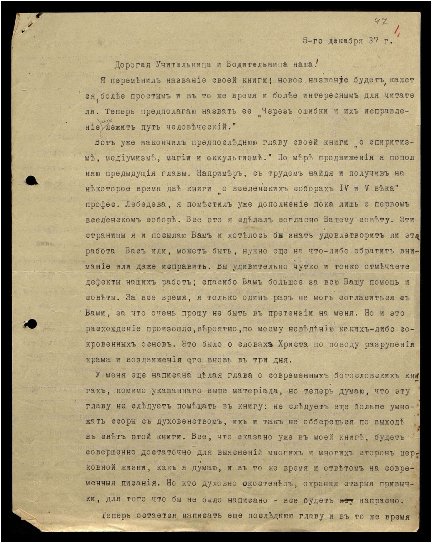 Вот уже закончил предпоследнюю главу своей книги "О спиритизме, медиумизме, магии и оккультизме". По мере продвижения я пополняю предыдущие главы. Например, с трудом найдя и получив на некоторое время две книги "О вселенских соборах IV и V века" профессора Лебедева, я поместил уже дополнение пока лишь о первом вселенском соборе. Все это я сделал согласно Вашему совету. Эти страницы я и посылаю Вам и хотелось бы знать удовлетворит ли эта работа Вас или, может быть, нужно еще на что-либо обратить внимание или даже исправить. Вы удивительно чутко и тонко отмечаете дефекты наших работ; спасибо Вам большое за всю Вашу помощь и советы. За все время, я только один раз не мог согласиться с Вами, за что очень прошу не быть в претензии на меня. Но и это расхождение произошло, вероятно, по моему неведению каких-либо сокровенных основ. Это было о словах Христа по поводу разрушения храма и воздвижения его вновь в три дня.
