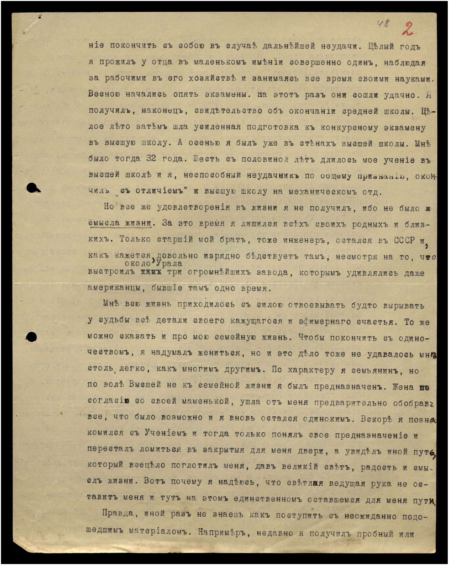 Весь мой жизненный путь ярко указывает на Высшее участие Светлой помощи. В детстве мне не давалась наука, и отец, горюя о моей участи, отдал меня обучению слесарному ремеслу в частную мастерскую в Риге, где я и пробыл 3,5 года среди побоев и всяческих унижений, как русский среди грубой и постоянно пьяной мастеровщины. После работал на фабриках и заводах, был слесарем в ж.д. депо, а затем ездил помощником машиниста и за машиниста, все время чувствуя, что я попал не в свою среду из интеллигентной семьи. Вероятно под влиянием этого чувства оторванности от родных мне условий, я начал учиться для подготовки за курс 4-х классов средней школы, а сдав этот экзамен, уже мог получить место маленького чиновника в акцизном управлении. Теперь на этой службе было значительно больше времени и не так уставал физически и потому мог с большим успехом отдаться своим наукам. Когда, наконец, приспело время, я совершенно бросил не приходившуюся мне по душе акцизную службу и на пол года с головою погрузился в науку. Экзамен сошел неудачно. Конечно, очень трудно было без посторонней помощи завершить эту работу. Вся моя родня восстала опять на меня, так как все считали меня неспособным к учению. Общая уверенность в моей неспособности наложила и на меня известный налет на мою душу и выработала какой-то отпечаток неуверенности в себе, который сказывается и до сего дня, мешающий во всех моих начинаниях. Но с другой стороны у меня нарастало какое-то упорство отчаяния и недовольство своей участью и я решился все же еще раз попробовать выбиться из разряда неудачников, затая в себе реше-