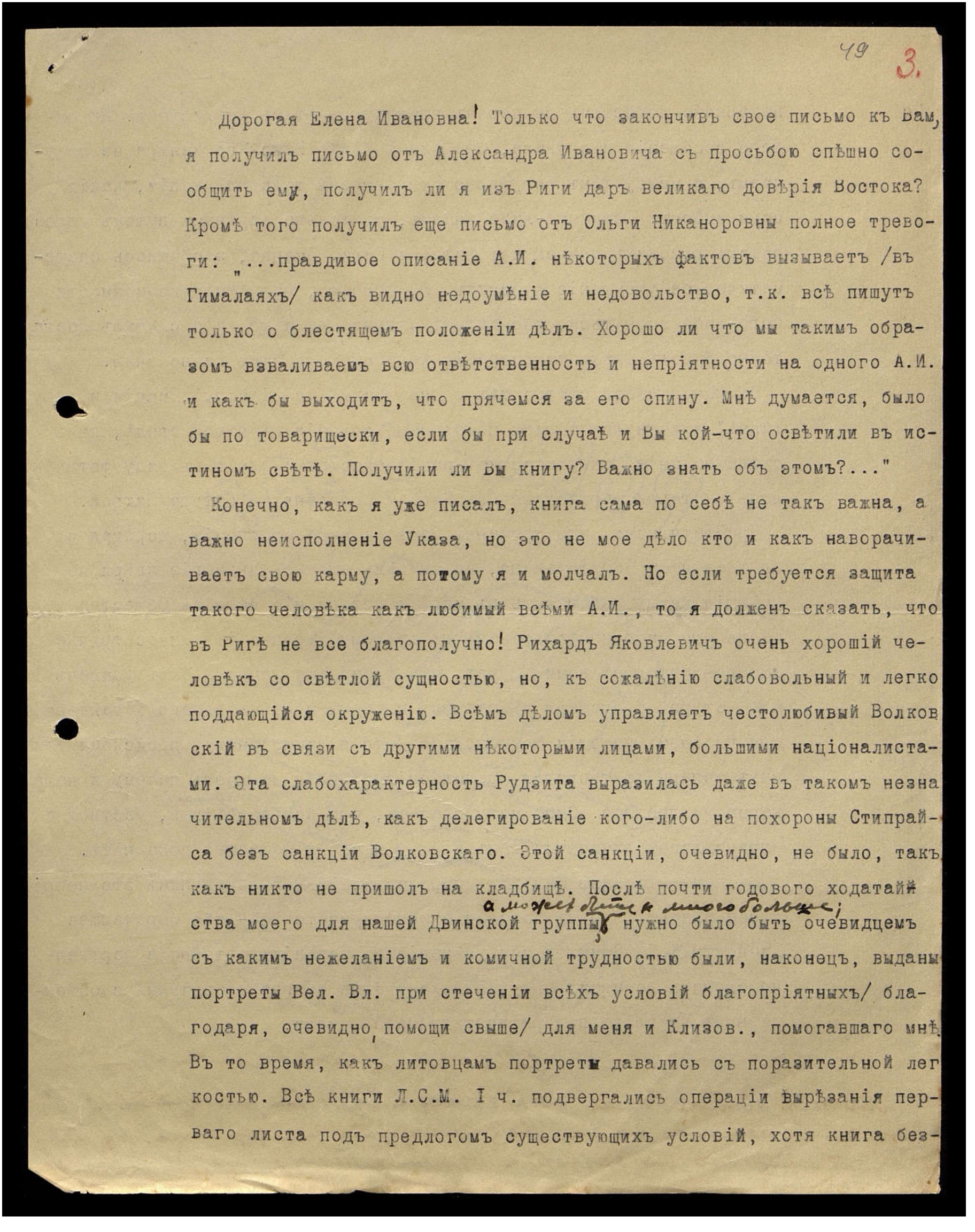Дорогая Елена Ивановна! Только что закончив свое письмо к Вам, я получил письмо от Александра Ивановича [Клизовского] с просьбою спешно сообщить ему, получил ли я из Риги дар великого доверия Востока? Кроме того, получил еще письмо от Ольги Никаноровны [Крауклис] полное тревоги: "...правдивое описание Александром Ивановичем [Клизовским] некоторых фактов вызывает (в Гималаях), как видно, недоумение и недовольство, т.к. все пишут только о блестящем положении дел. Хорошо ли, что мы таким образом взваливаем всю ответственность и неприятности на одного Александра Ивановича и как бы выходит, что прячемся за его спину. Мне думается, было бы по-товарищески, если бы при случае и Вы кое-что осветили в истинном свете. Получили ли Вы книгу? Важно знать об этом?..."