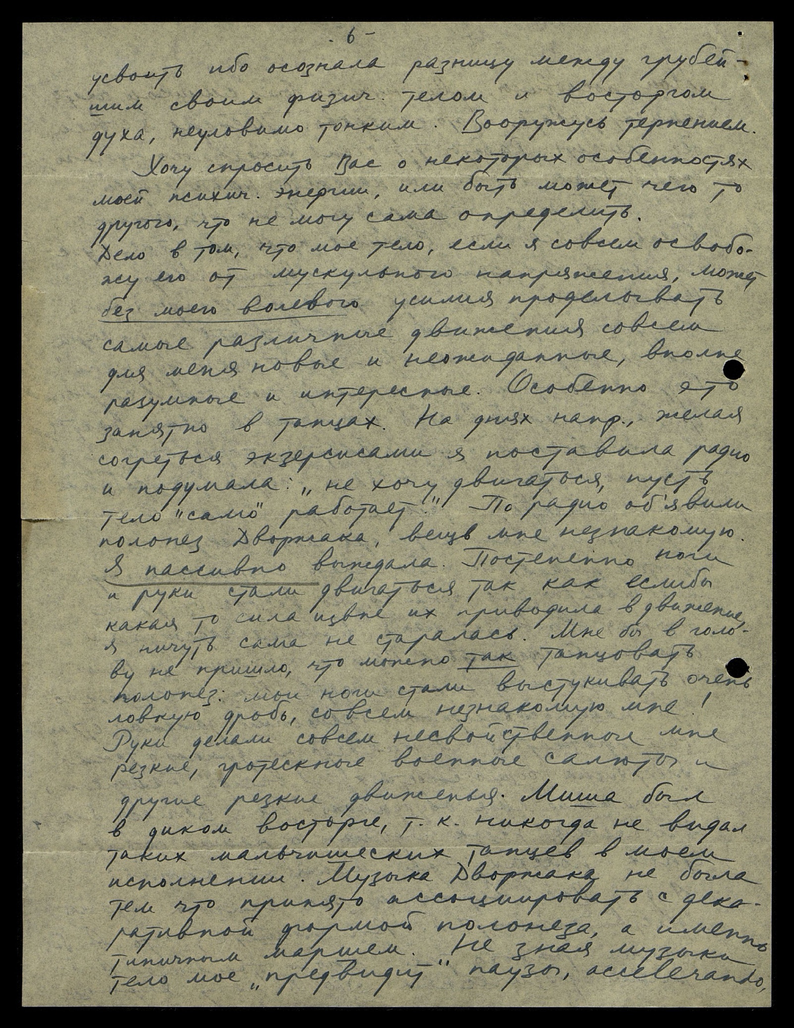 Хочу спросить Вас о некоторых особенностях моей психич[еской] энергии или, быть может, чего-то другого, что не могу сама определить. Дело в том, что моё тело, если я совсем освобожу его от мускульного напряжения, может без моего волевого усилия проделывать самые различные движения, совсем для меня новые и неожиданные, вполне разумные и интересные. Особенно это занятно в танцах. На днях, например, желая согреться экзерсисами, я поставила радио и подумала: " Не хочу двигаться, пусть тело "само" работает". По радио объявили полонез Дворжака, вещь мне незнакомую. Я пассивно выждала. Постепенно ноги и руки стали двигаться так, как если бы какая-то сила извне их приводила в движение, я ничуть сама не старалась. Мне бы в голову не пришло, что можно так танцевать полонез: мои ноги стали выстукивать очень ловкую дробь, совсем незнакомую мне! Руки делали совсем несвойственные мне резкие движенья. Миша был в диком восторге, т[ак] к[ак] никогда не видал таких мальчишеских танцев в моём исполнении. Музыка Дворжика не была тем, что принято ассоциировать с декоративной формой полонеза, а именно, типичным маршем. Не зная музыки, тело моё "предвидит" паузы, accelerando [итал.: ускорения]
