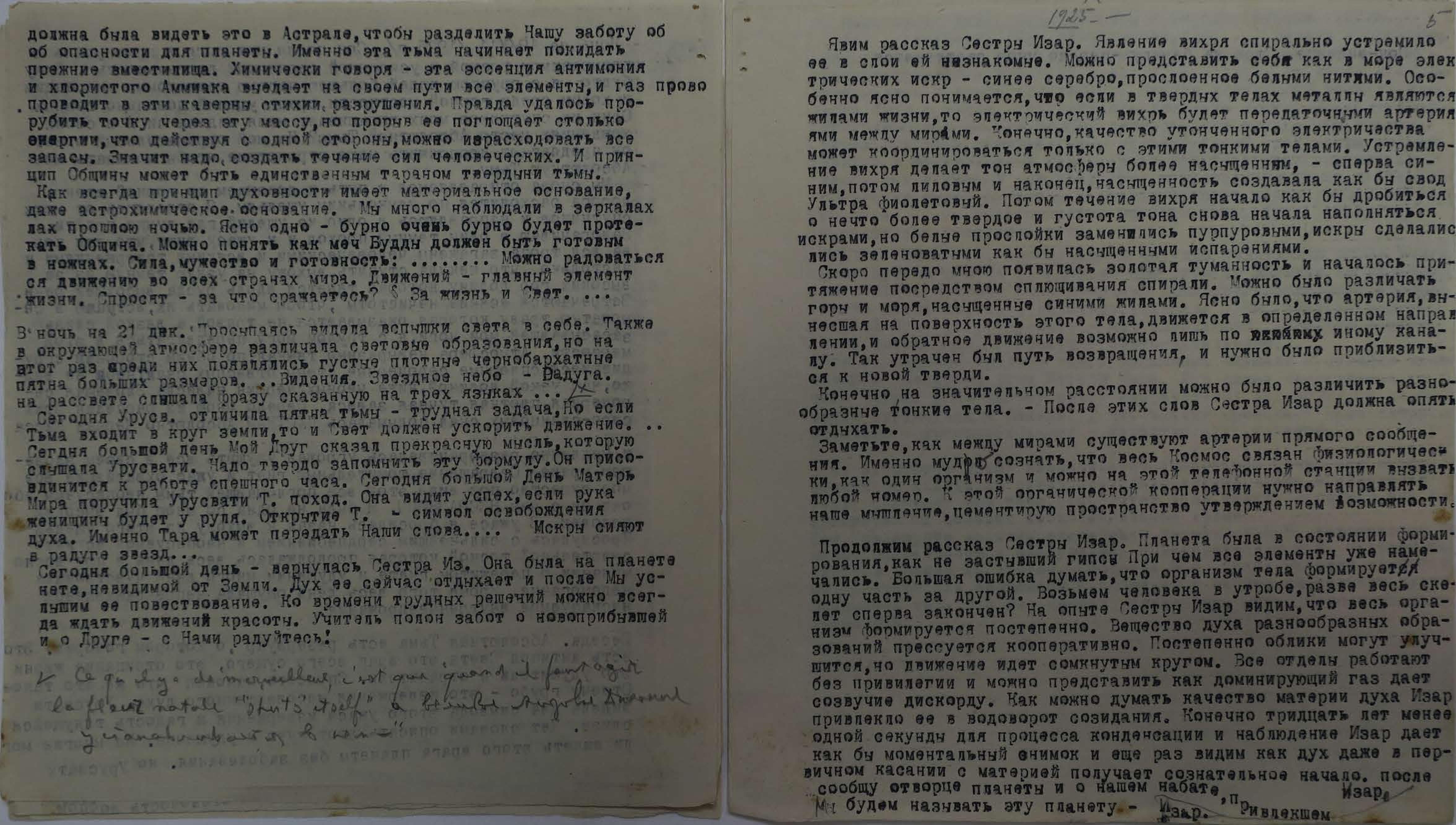 [21.XII.1925.] Сегодня большой день − вернулась Сестра Из[ар]. Она была на планете, невидимой от Земли. Дух ее сейчас отдыхает и после Мы услышим ее повествование. Ко времени трудных решений можно всегда ждать движений красоты. Учитель полон забот о новоприбывшей и о Друге − с Нами радуетесь!