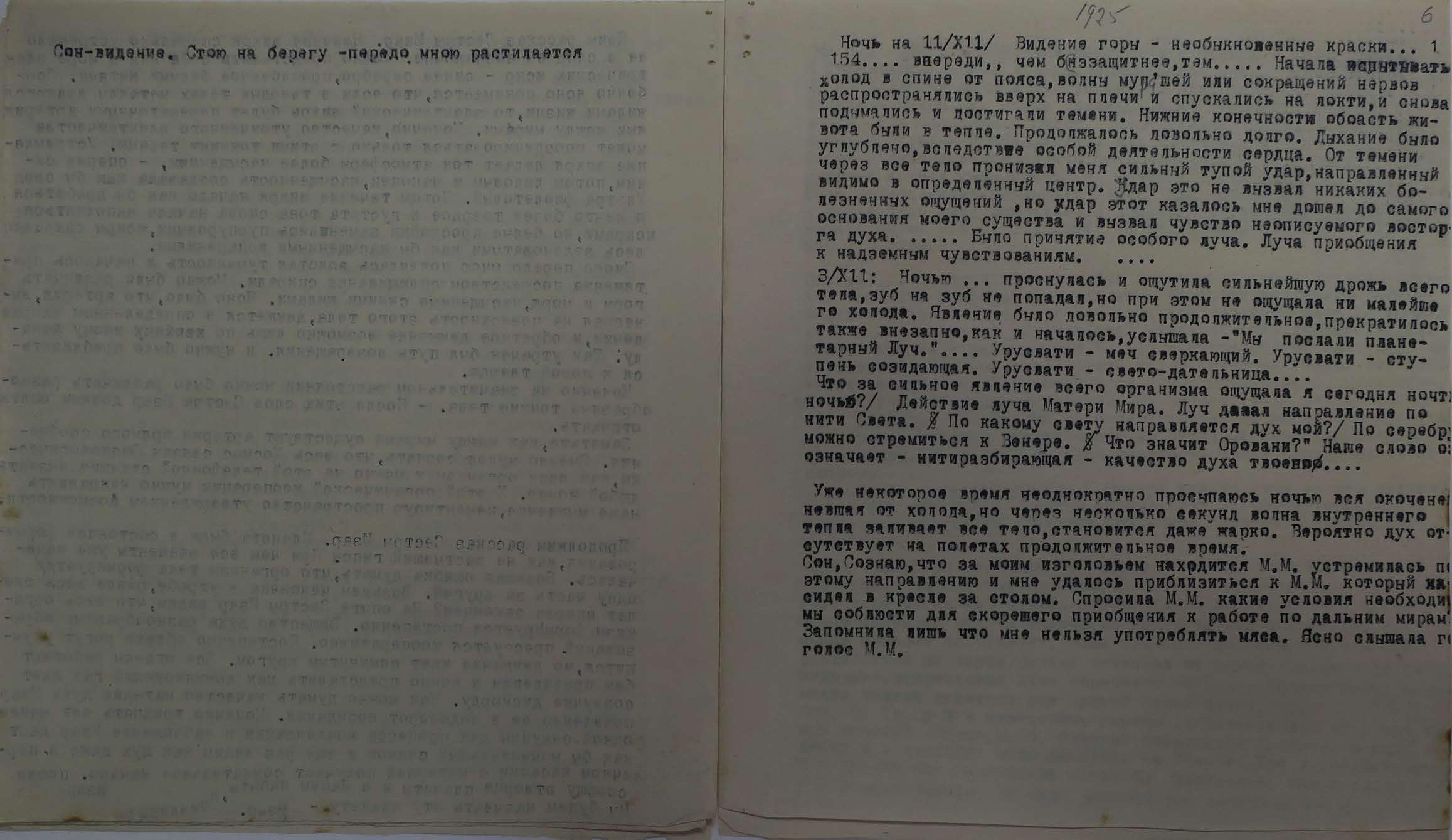 Ночь на 11/ХII/[1925]. Видение горы - необыкновенные краски... впереди, чем беззащитнее, тем... Начала испытывать холод в спине от пояса, волны мурашей или сокращений нервов распространялись вверх на плечи и спускались на локти, и снова подымались и достигали темени. Нижние конечности, область живота были в тепле. Продолжалось довольно долго. Дыхание было углублено, вследствие особой деятельности сердца. От темени через все тело пронзил меня сильный тупой удар, направленный, видимо, в определенный центр. Удар этот не вызвал никаких болезненных ощущений, но удар этот, казалось, мне дошел до самого основания моего существа и вызвал чувство неописуемого восторга духа. Было принятие особого луча. Луча приобщения к надземным чувствованиям...