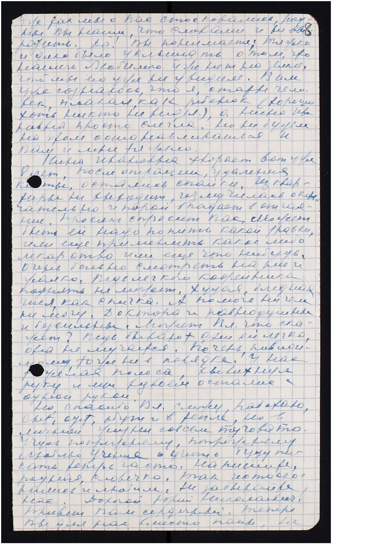 Нина Ивановна хворает вот уже 8 лет. После операции удаления кисты остались спайки. Из квартиры не выходит, измучилась окончательно и порой впадает в отчаяние. Просит спросить Вас, может быть ей надо попить, какой травки, или ещё применить какое-либо лекарство или ещё что-нибудь. Очень больно смотреть на неё и жалко. Ведь легкого кофейника поднять не может. Худая, бледная, шея как спичка. А помочь ничем не могу. Доктора и равнодушны, и бессильны. Может Вл[адыка] что скажет? Ведь бывают дни − ей легко, она не мучается. Печень, по-видимому, уже не в порядке. У нас тяжелая полоса − вывихнул руку, и мы вдвоем остались с одной рукой.