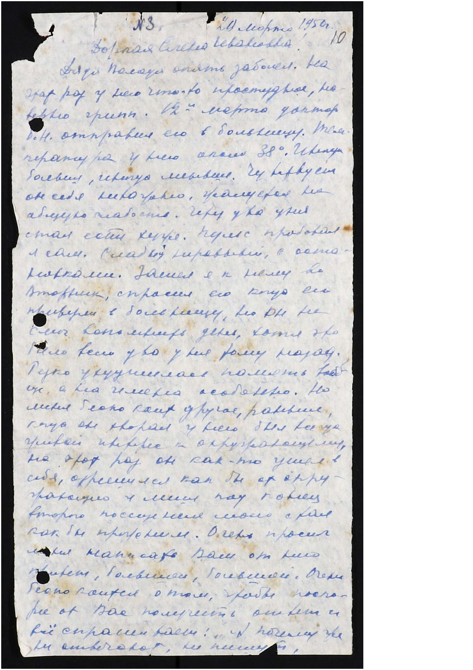 Дядя Володя опять заболел. На этот раз у него что-то простудное, наверно грипп. 12-го марта доктор Борис Николаевич [Чистяков] отправил его в больницу. Температура у него 38º. Иногда больше, иногда меньше. Чувствует он себя неважно, жалуется на общую слабость. Через два дня стал есть хуже. Пульс пробовал я сам. Слабый неровный, с остановками. Зашел я к нему во вторник, спросил его, когда его привезли в больницу, но он не смог вспомнить день, хотя это было всего два дня тому назад. Резко ухудшилась память вообще, а на имена особенно. Но меня беспокоит другое, раньше, когда он хворал, у него был всегда живой интерес к окружающему, на этот раз он как-то ушел в себя, отрешился как бы от окружающего и лишь под конец второго посещения моего стал как бы прежним. Очень просил меня написать Вам от него привет, большой, большой. Очень беспокоится о том, чтобы поскорее от Вас получить ответ и всё спрашивает: "Почему же не отвечают, не пишут,