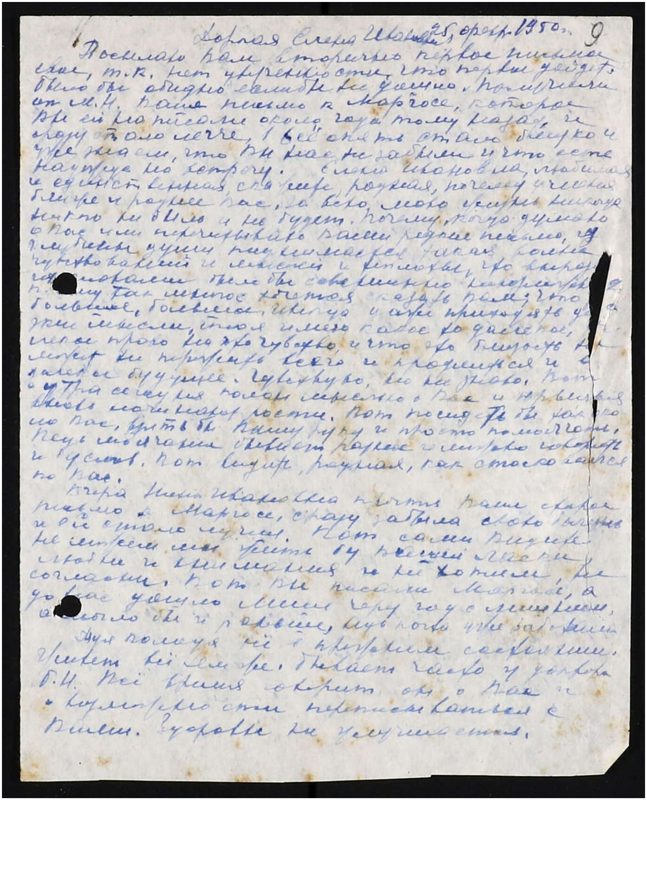 Посылаю Вам вторично первое письмо своё, т.к. нет уверенности, что первое дойдет. Было бы обидно если бы не дошло. Получили от Марии Николаевны [Варфоломеевой] Ваше письмо к Маргосе, которое Вы ей написали около года тому назад, и сразу стало легче. Всё опять стало близко, и уже знаем, что Вы нас не забыли и что есть надежда на встречу. Елена Ивановна, любимая и единственная, скажите, родная, почему у меня ближе и роднее Вас, за всю мою жизнь никогда не было и не будет. Почему, когда думаю о Вас или перечитываю Ваши редкие письма, из глубины души поднимается такая волна чувствований и мыслей, и теплоты, что выразить их словами было бы совершенно невозможно. Почему так многое хочется сказать Вам; что[-то] большое, большое, иногда даже приходят д[ер]зкие мысли, что имею какое-то далекое, [да]лекое право на это чувство, и что эта близость не может не пережить всего и продлиться в далекое будущее. Чувствую, но не знаю. Вот с утра сегодня полон мыслью о Вас и крылья вновь начинают расти. Вот посидеть бы так около Вас, взять бы Вашу руку и просто помолчать. Ведь молчание бывает разное и можно говорить и без слов. Вот видите, родная, как стосковался по Вас.