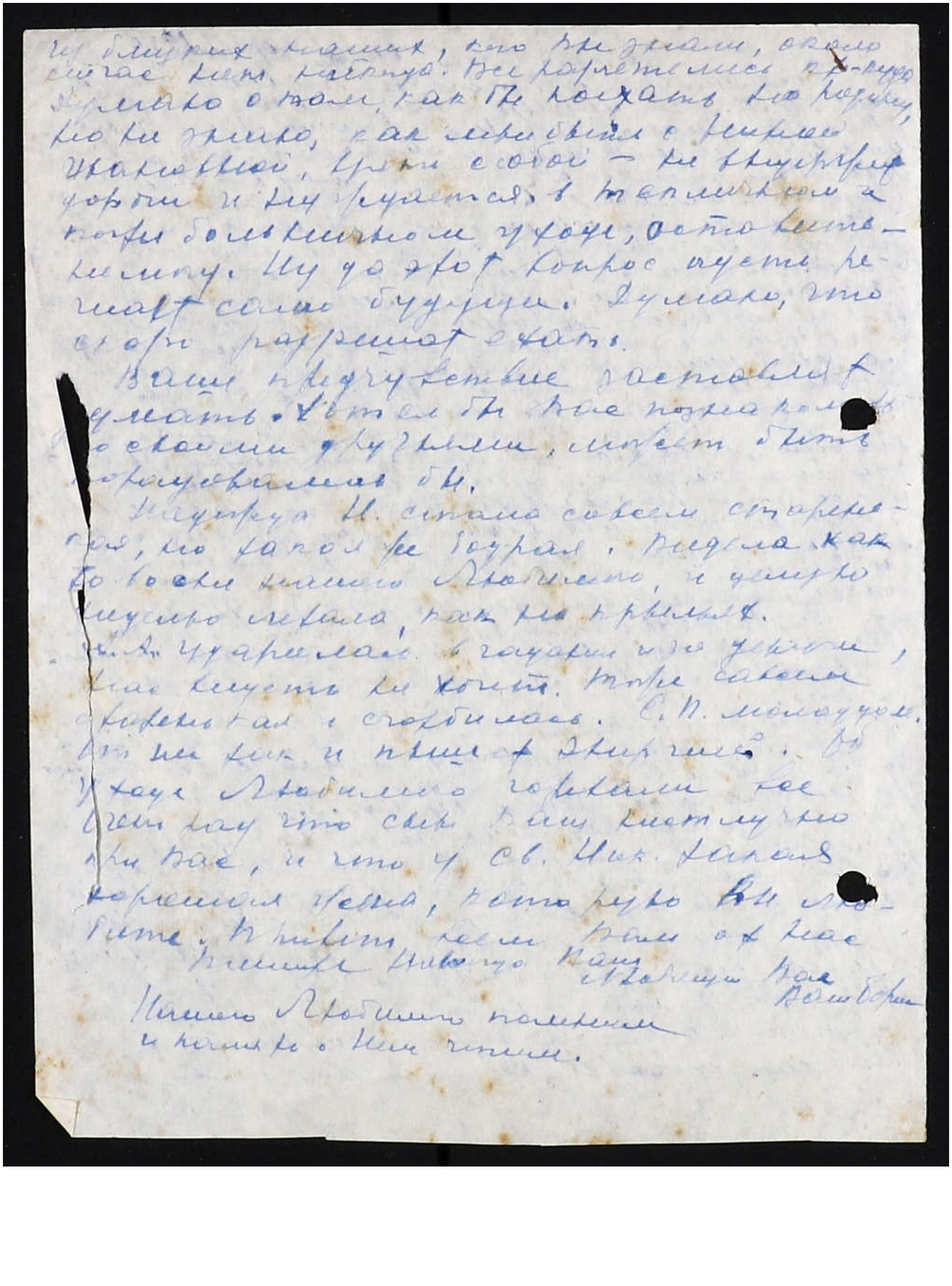 забывайте, пишите нам, как живете, что думаете делать, когда встретимся. Нина Ив[ановна] Вам шлет свой привет, она Вас любит и часто, и хорошо вспоминает. Мария Ник[олаевна] нас не забывает и Е.Н. тоже. О Маргосе уже несколько лет ничего не знаю. Александра Александровна говорила нам, что в прошлом году она несколько раз беседовала и подолгу с Н.К., и когда мы в этом усомнились, она страшно обиделась... Вы наверное, очень этому удивитесь?!