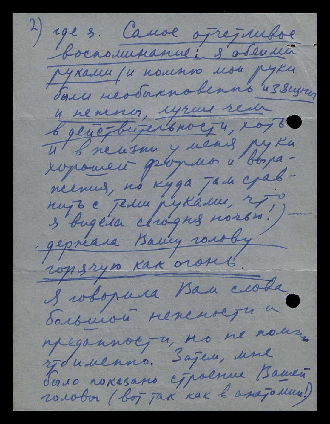 где я. Самое отчётливое воспоминание: я обеими руками (и помню мои руки были необыкновенно изящны и нежны, лучше, чем в действительности, хоть и в жизни у меня руки хорошей формы и выражения, но куда там сравнить с теми руками, что я видела сегодня ночью!) — держала Вашу голову, горячую как огонь. Я говорила Вам слова большой нежности и преданности, но не помню, что именно. Затем, мне было показано строение Вашей головы (вот так, как в анатомии!),
