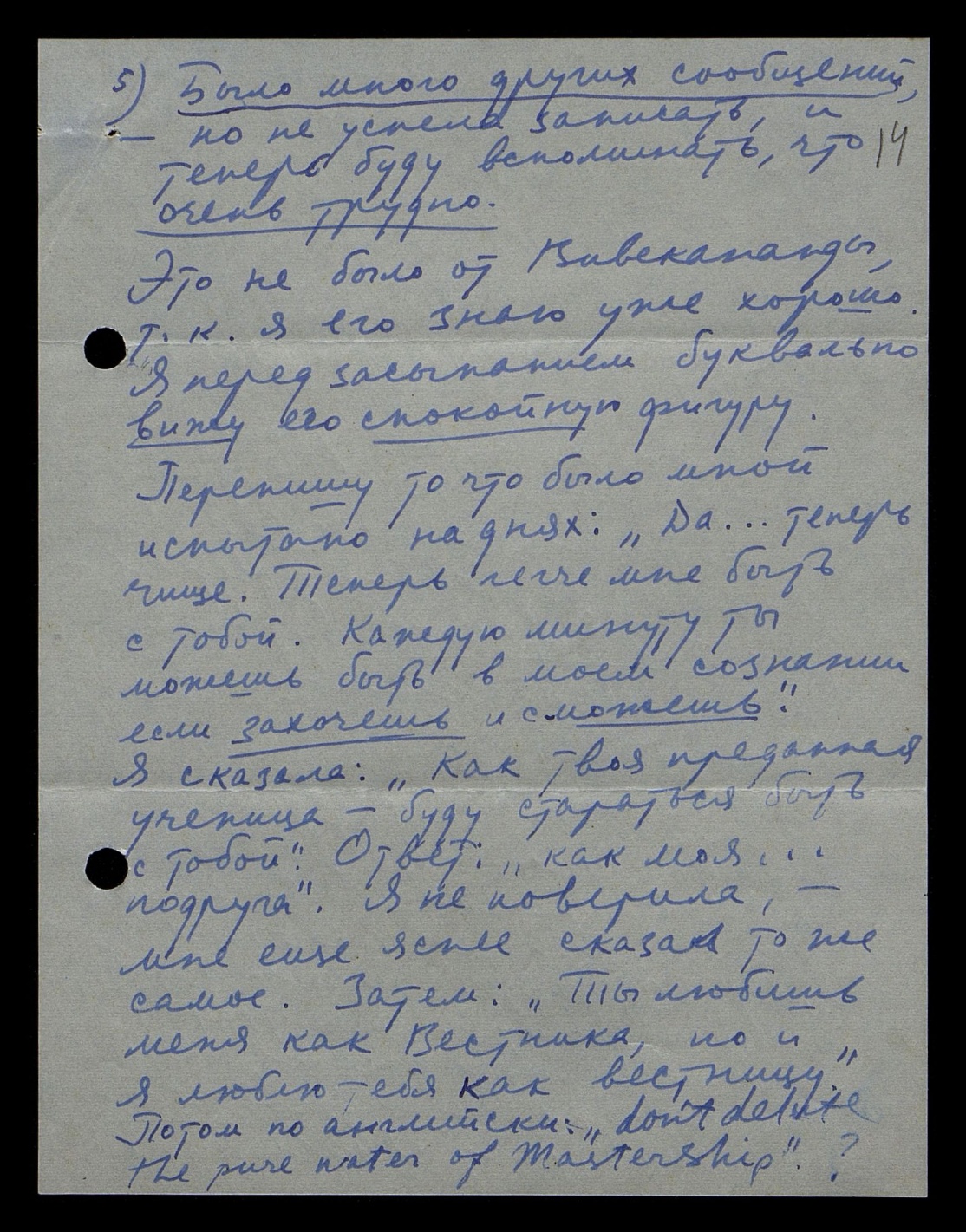 Это не было от Вивекананды, так как я его знаю уже хорошо. Я перед засыпанием буквально вижу его спокойную фигуру. Перепишу то, что было мной испытано на днях: «Да… теперь чище. Теперь легче мне быть с тобой. Каждую минуту ты можешь быть в моём сознании, если захочешь и сможешь». Я сказала: «Как твоя преданная ученица — буду стараться быть с тобой». Ответ: «Как моя… подруга». Я не поверила, — мне ещё яснее сказал то же самое. Затем: «Ты любишь меня как Вестника, но и я люблю тебя как вестницу». Потом по-английски: «Don't dilute the pure water of Mastership [англ.: Не разбавляйте чистую воду Мастерства]"?