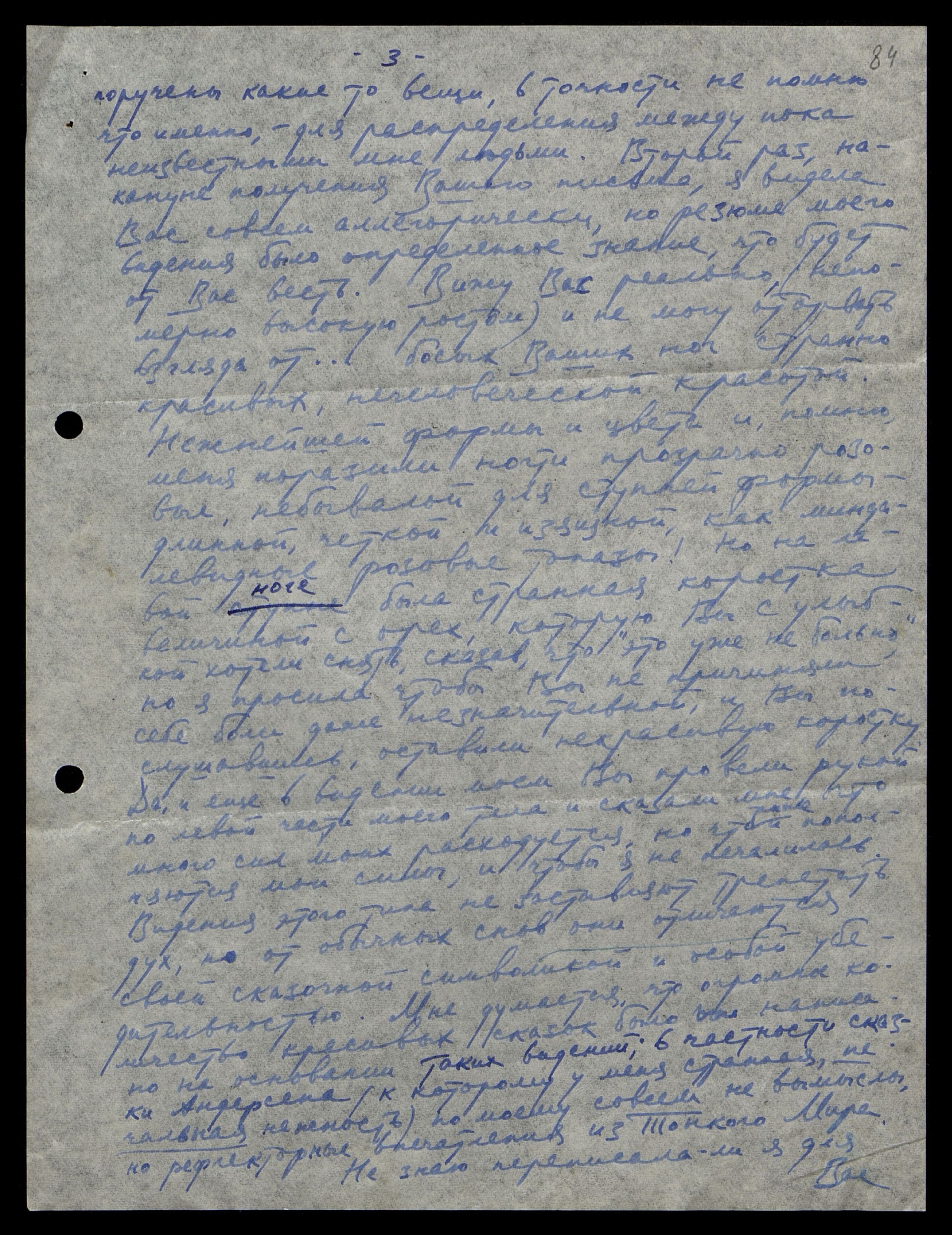 поручены какие-то вещи, в точности не помню, что именно, — для распределения между пока неизвестными мне людьми. Второй раз, накануне получения Вашего письма, я видела Вас совсем аллегорически, но резюме моего видения было определённое знание, что будет от Вас весть. Вижу Вас реально, (непомерно высокую ростом) и не могу оторвать взгляда от… босых Ваших ног странно красивых, нечеловеческой красоты. Нежнейшей формы и цвета и, помню меня поразили ногти прозрачно-розовые, небывалой для ступней формы — длинной, чёткой и изящной, как миндалевидные розовые топазы! Но на левой ноге была странная коростка величиной с орех, которую Вы с улыбкой хотели снять, сказав, что «это уже не больно», но я просила, чтобы Вы не причиняли себе боли даже незначительной, и Вы послушавшись, оставили некрасивую коростку. Да, и ещё в видении моём Вы провели рукой по левой части моего тела и сказала мне, что много сил моих расходуется, но что также и пополняются мои силы, и чтобы я не печалилась. Видения этого типа не заставляют трепетать дух, но от обычных снов они отличаются своей сказочной символикой и особой убедительностью. Мне думается, что огромное количество красивых сказок было написано на основании таких видений; в частности, сказки Андерсена (к которому у меня странная печальная нежность) по-моему совсем не вымыслы, но рефлекторные впечатления из Тонкого Мира.