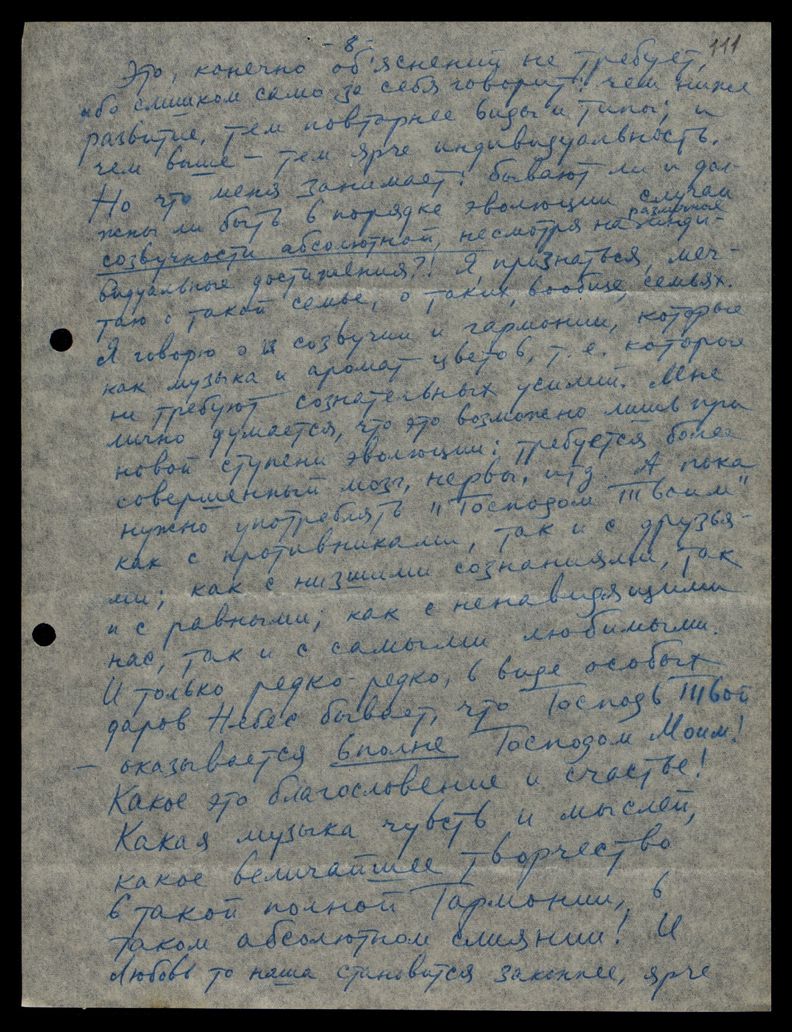 Это, конечно, объяснений не требует, ибо слишком само за себя говорит: чем ниже развитие, тем повторнее виды и типы; и чем выше — тем ярче индивидуальность. Но что меня занимает: бывают ли и должны ли быть в порядке эволюции случаи созвучности абсолютной, несмотря на различные индивидуальные достижения?! Я, признаться, мечтаю о такой семье, о таких, вообще, семьях. Я говорю о созвучии и гармонии, которые как музыка и аромат цветов, то есть которые не требуют сознательных усилий. Мне лично думается, что это возможно лишь при новой ступени эволюции: требуется более совершенный мозг, нервы, и так далее. А пока нужно употреблять «Господом Твоим» как с противниками, так и с друзьями; как с низшими сознаниями, так и с равными; как с ненавидящими нас, так и с самыми любимыми. И только редко–редко, в виде особых даров Небес бывает, что Господь Твой — оказывается вполне Господом моим! Какое это благословение и счастье! Какая музыка чувств и мыслей, какое величайшее творчество в такой полной Гармонии, в таком абсолютном слиянии! И Любовь-то наша становится законнее, ярче,