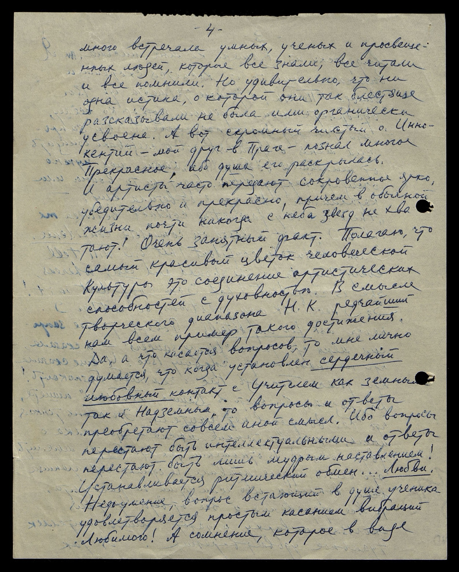 много встречала умных, учёных и просвещённых людей, которые всё знали, всё читали и всё помнили. Но удивительно, что ни одна истина, о которой они так блестяще рассказывали, не была ими органически усвоена. А вот скромный, чистый Иннокентий — мой друг в Праге — познал многое Прекрасное, ибо душа его раскрылась. И артисты часто передают сокровенное ярко, убедительно и прекрасно, причём в обычной жизни почти никогда с неба звёзд не хватают! Очень занятный факт. Полагаю, что самый красивый цветок человеческой культуры это соединение артистических способностей с духовностью. В смысле творческого диапазона Н[иколай К[онстантинович] редчайший нам всем пример такого достижения. Да, а что касается вопросов, то мне лично думается, что когда установлен сердечный любовный контакт с Учителем, как земным так и Надземным, то вопросы и ответы приобретают совсем иной смысл. Ибо вопросы перестают быть интеллектуальными и ответы перестают быть лишь мудрым наставлением! Устанавливается ритмический обмен… Любви. Недоумение, вопрос встающий в душе ученика удовлетворяется простым касанием вибраций Любимого! А сомнение, которое в виде