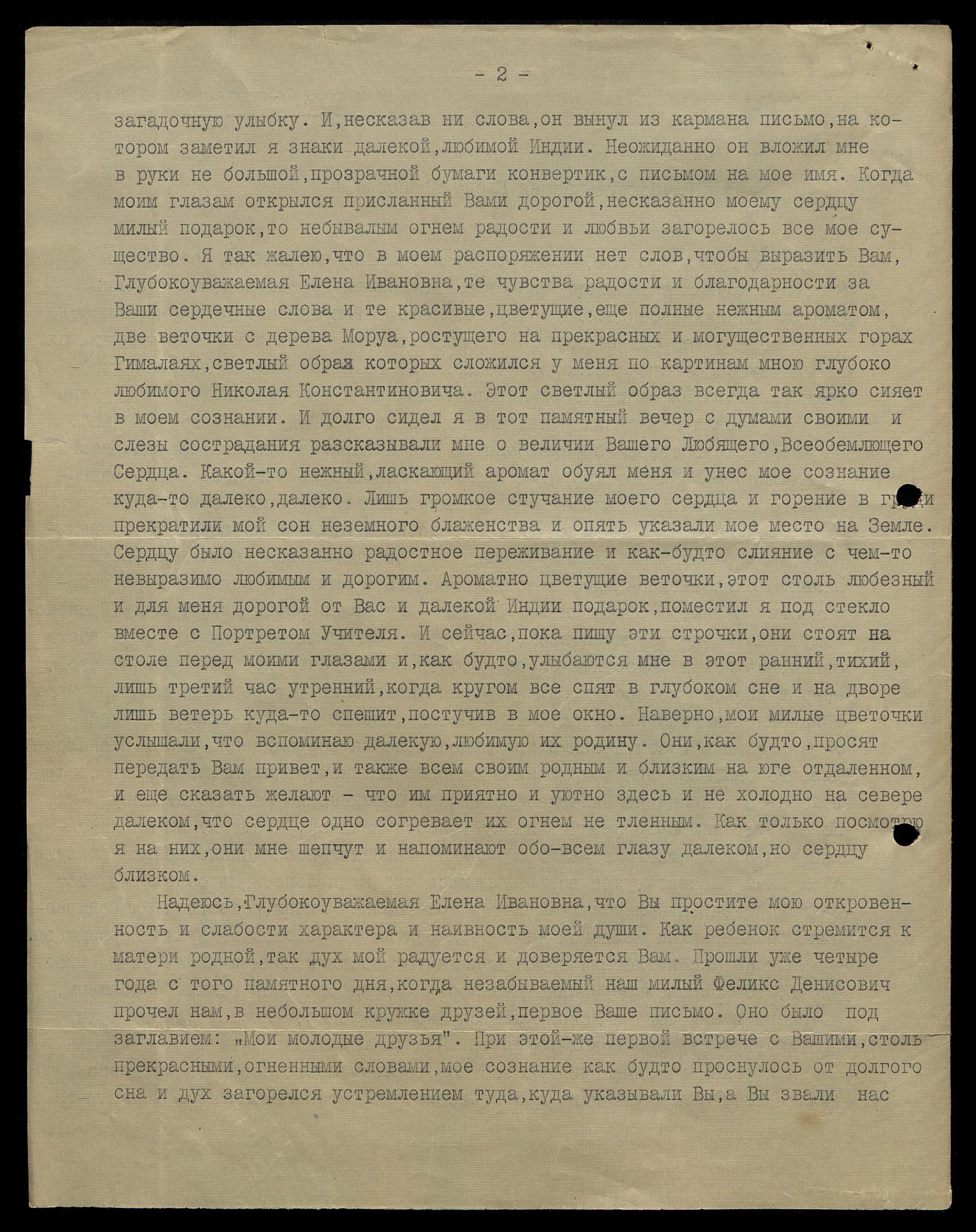 загадочную улыбку. И, не сказав ни слова, он вынул из кармана письмо, на котором заметил я знаки далекой, любимой Индии. Неожиданно он вложил мне в руки небольшой, прозрачной бумаги конвертик, с письмом на моё имя. Когда моим глазам открылся присланный Вами дорогой, несказанно моему сердцу милый подарок, то небывалым огнем радости и любви загорелось всё моё существо. Я так жалею, что в моём распоряжении нет слов, чтобы выразить Вам, Глубокоуважаемая Елена Ивановна, те чувства радости и благодарности за Ваши сердечные слова и те красивые, цветущие, еще полные нежным ароматом, две веточки с дерева Моруа, растущего на прекрасных и могущественных горах Гималаях, светлый образ которых сложился у меня по картинам мною глубоко любимого Николая Константиновича. Этот светлый образ всегда так ярко сияет в моём сознании. И долго сидел я в тот памятный вечер с думами своими, и слезы сострадания рассказывали мне о величии Вашего Любящего, Всеобъемлющего Сердца. Какой-то нежный, ласкающий аромат обуял меня и унес моё сознание куда-то далеко, далеко. Лишь громкое стучание моего сердца и горение в груди прекратили мой сон неземного блаженства и опять указали моё место на Земле. Сердцу было несказанно радостное переживание и как-будто слияние с чем-то невыразимо любимым и дорогим. Ароматно цветущие веточки, этот столь любезный и для меня дорогой от Вас и далекой Индии подарок, поместил я под стекло вместе с Портретом Учителя. И сейчас, пока пишу эти строчки, они стоят на столе перед моими глазами и как будто улыбаются мне в этот ранний, тихий, лишь третий час утренний, когда кругом все спят в глубоком сне и на дворе лишь ветер куда-то спешит, постучав в моё окно. Наверно, мои милые цветочки услышали, что вспоминаю далекую, любимую их родину. Они, как будто, просят передать Вам привет, и также всем своим родным и близким на юге отдаленном, и еще сказать желают, что им приятно и уютно здесь и не холодно на севере далеком, что сердце одно согревает их огнем нетленным. Как только посмотрю я на них, они мне шепчут и напоминают обо всем глазу далеком, но сердцу близком.