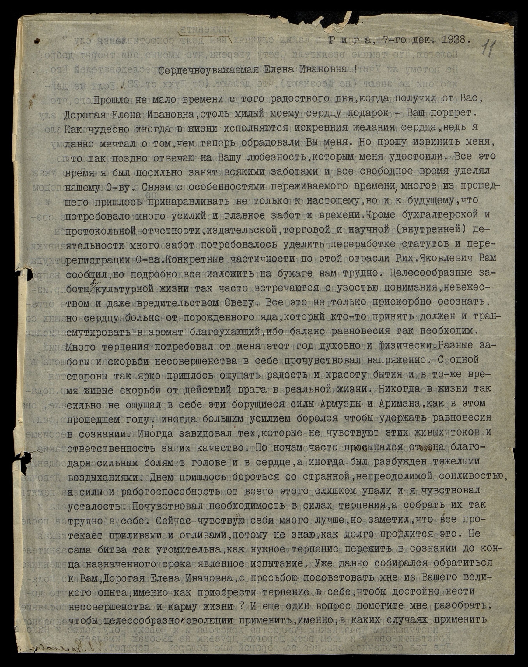 Прошло немало времени с того радостного дня, когда получил от Вас, Дорогая Елена Ивановна, столь милый моему сердцу подарок − Ваш портрет. Как чудесно иногда в жизни исполняются искренние желания сердца, ведь я давно мечтал о том, чем теперь обрадовали Вы меня. Но прошу извинить меня, что так поздно отвечаю на Вашу любезность, который меня удостоили. Все это время я был сильно занят всякими заботами и всё свободное время уделял нашему Обществу. Связи с особенностями переживаемого времени, многое из прошедшего пришлось принаравливать не только к настоящему, но и к будущему, что потребовало много усилий и главное забот и времени. Кроме бухгалтерской и протокольной отчетности, издательской, торговой и научной (внутренней) деятельности много забот потребовалось уделить переработке статутов [уставов] и перерегистрации Общества. Конкретные частичности по этой отрасли Рихард Яковлевич [Рудзитис] Вам сообщил, но подробно все изложить на бумаге нам трудно. Целесообразные заботы культурной жизни так часто встречаются с узостью понимания, невежеством и даже вредительством Свету. Все это не только прискорбно осознать, но сердцу больно от порожденного яда, который кто-то принять должен и трансмутировать в аромат благоухающий, ибо баланс равновесия так необходим. Много терпения потребовал от меня этот год духовно и физически. Разные заботы и скорби несовершенства в себе прочувствовал напряженно. С одной стороны так ярко пришлось ощущать радость и красоту бытия и в то же время живые скорби от действий врага в реальной жизни. Никогда в жизни так сильно не ощущал в себе эти борющиеся силы Армузды и Аримана, как в этом прошедшем году; иногда большим усилием боролся, чтобы удержать равновесия в сознании. Иногда завидовал тем, которые не чувствуют этих живых токов и ответственность за их качество. По ночам часто просыпался от сна благодаря сильным болям в голове и в сердце, а иногда был разбужден тяжелыми воздыханиями. Днем пришлось бороться со странной, непреодолимой сонливостью, а силы и работоспособность от всего этого слишком упали и я чувствовал усталость. Почувствовал необходимость в силах терпения, а собрать их так трудно в себе. Сейчас чувствую себя много лучше, но заметил, что все протекает приливами и отливами, потому не знаю, как долго продлится это. Не сама битва так утомительна, как нужное терпение пережить в сознании до конца назначенного срока явленное испытание. Уже давно собирался обратиться к Вам, дорогая Елена Ивановна, с просьбою посоветовать мне из Вашего великого опыта, именно, как приобрести терпение в себе, чтобы достойно нести несовершенства и карму жизни? И еще один вопрос помогите мне разобрать, чтобы целесообразно к эволюции применить, именно, в каких случаях применить