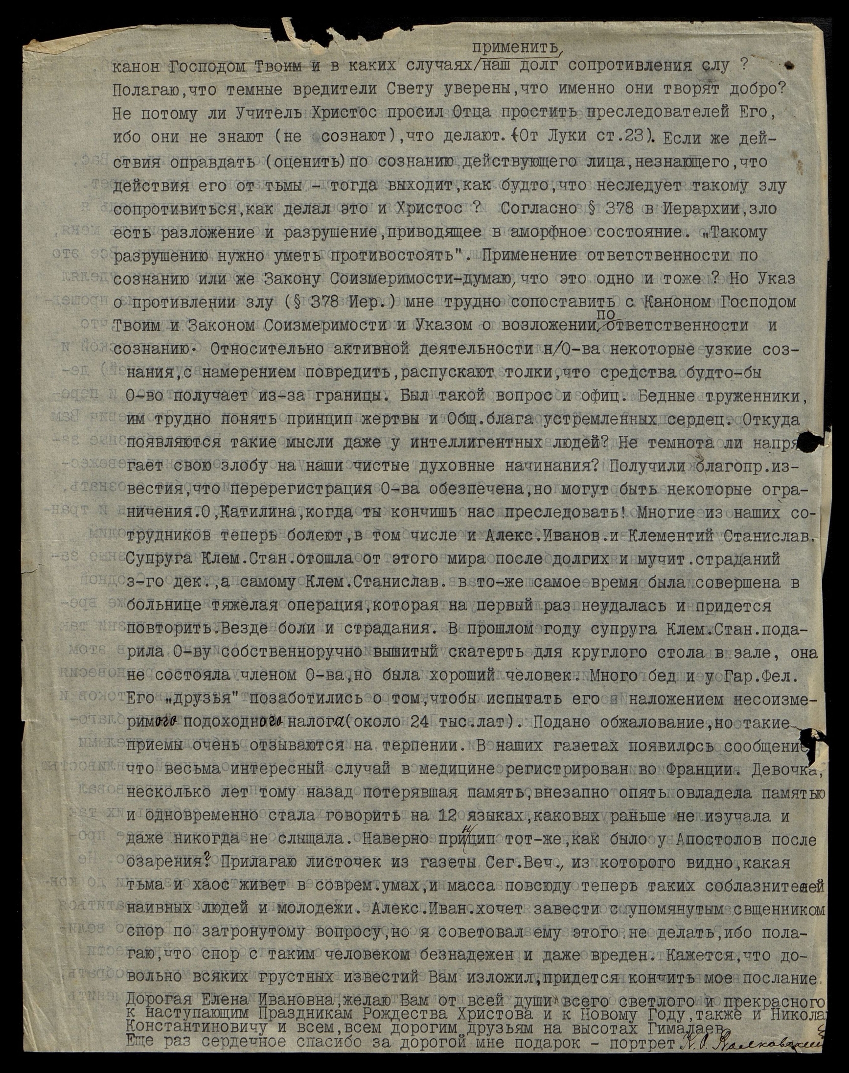 канон Господом Твоим и в каких случаях применить наш долг сопротивления. Полагаю, что темные вредители Свету уверены, что именно они творят добро? Не потому ли Учитель Христос просил Отца простить преследователей Его, ибо они не знают (не сознают), что делают (От Луки, ст.23). Если же действия оправдать (оценить) по сознанию действующего лица, не знающего, что действия его от тьмы, тогда выходит, как будто, что не следует такому злу сопротивляться, как делал это и Христос? Согласно § 378 в Иерархии, зло есть разложение и разрушение, приводящее в аморфное состояние. "Такому разрушению нужно уметь противостоять". Применение ответственности по сознанию или же Закону Соизмеримости − думаю, что это одно и тоже? Но Указ о противлении злу (§ 378, Иерархия) мне трудно сопоставить с Каноном Господом Твоим и Законом Соизмеримости, и Указом о возложении по ответственности и сознанию. Относительно активной деятельности Общества некоторые узкие сознания с намерением повредить распускают толки, что средства будто бы Общество получает из-за границы. Был такой вопрос и официальный. Бедные труженики, им трудно понять принцип жертвы и Общего блага устремленных сердец. Откуда появляются такие мысли даже у интеллигентных людей? Не темнота ли напрягает свою злобу на наши чистые духовные начинания? Получили благоприятные известия, что перерегистрация Общества обеспечена, но могут быть некоторые ограничения. О, Катилина*, когда ты кончишь нас преследовать! Многие из наших сотрудников теперь болеют, в том числе и Александр Иванович [Клизовский], и Клементий Станиславович [Вайчулянис]. Супруга Клементия Станиславовича отошла от этого мира после долгих и мучительных страданий 3-го декабря, а самому Клементию Станиславовичу в то же самое время была совершена в больнице тяжелая операция, которая на первый раз не удалась и придется повторить. Везде боли и страдания. В прошлом году супруга Клементия Станиславовича подарила Обществу собственноручно вышитую скатерть для круглого стола в зале, она не состояла членом Общества, но была хороший человек. Много бед и у Гаральда Феликсовича [Лукина]. Его "друзья" позаботились о том, чтобы испытать его наложением несоизмеримого подоходного налога (около 24 тыс. лат). Подано обжалование, но такие приемы очень отзываются на терпении. В наших газетах появилось сообщение, что весьма интересный случай в медицине регистрирован во Франции. Девочка, несколько лет тому назад потерявшая память, внезапно опять овладела памятью и одновременно стала говорить на 12 языках, каковых раньше не изучала и даже никогда не слышала. Наверное, принцип тот же, как было у Апостолов после озарения? Прилагаю листочек из газеты Сег. Веч., из которого видно, какая тьма и хаос живет в современных умах, и масса повсюду теперь таких соблазнителей наивных людей и молодежи. Александр Иванович [Клизовский] хочет завести с упомянутым священником спор по затронутому вопросу, но я советовал ему этого не делать, ибо полагаю, что спор с таким человеком безнадежен и даже вреден. Кажется, что довольно всяких грустных известий Вам изложил, придется кончить моё послание.