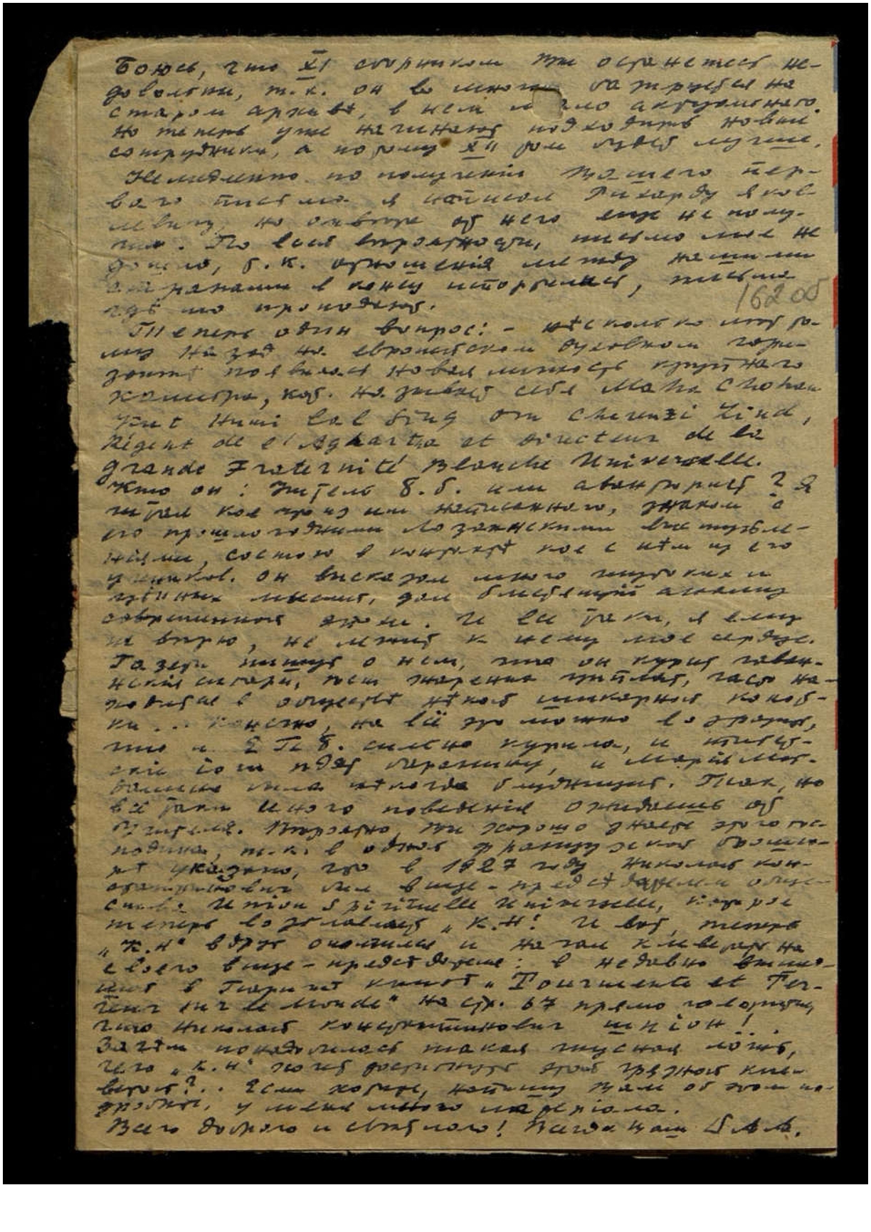 Я тоже твёрдо верю в звезду многострадальной Родины нашей и знаю, что из всех тяжёлых испытаний и потрясений она выйдет победительницей. Великая страна — велико сужденное ей будущее! Для такой страны стоит жить и работать — работать не покладая рук. Дошли ли уже до Вас письма мои № 4 и № 5, отправленные простой почтой?