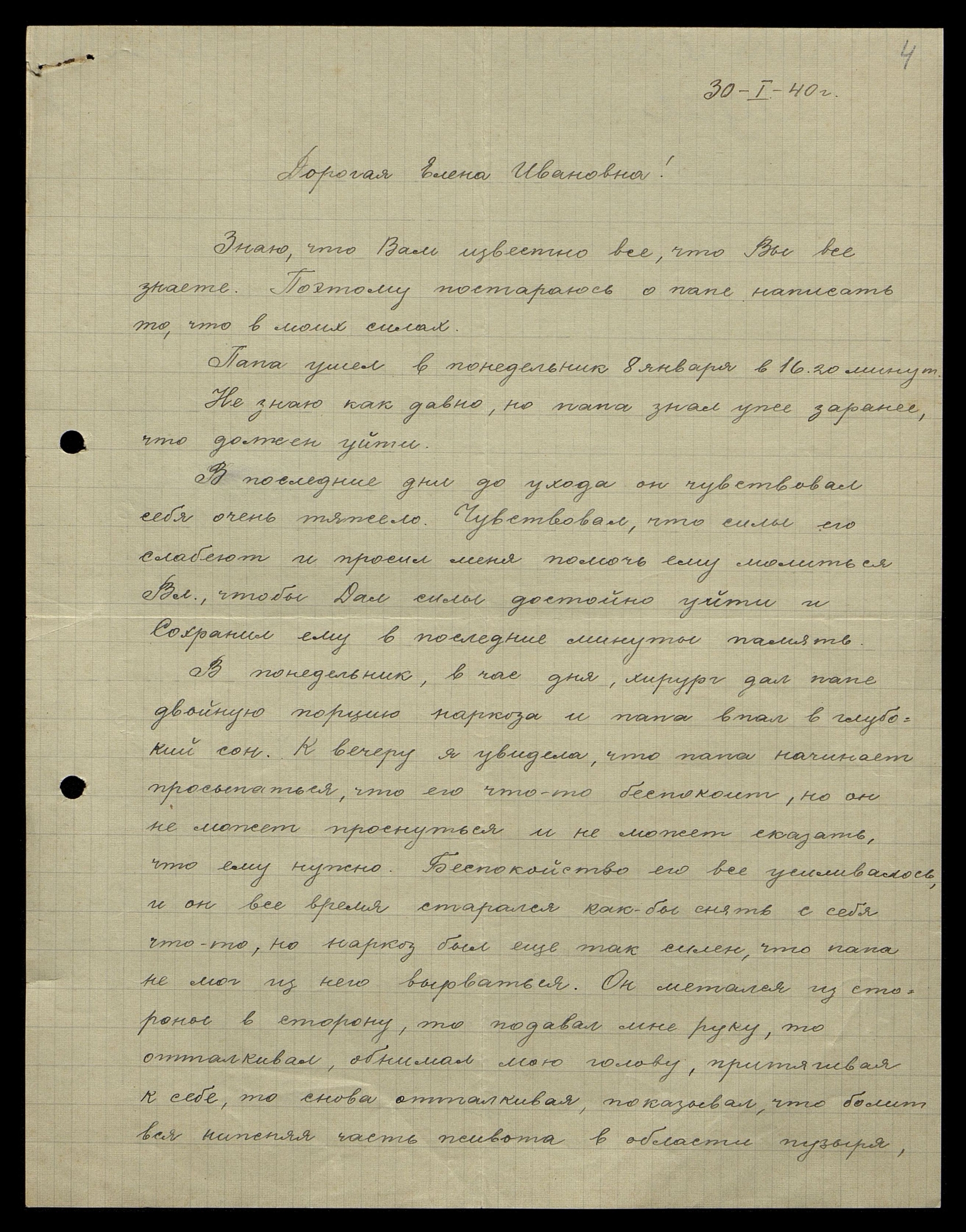 Вдруг папе в глазах потемнело и его страдания стали невозможными. Он стал вставать с кровати и все хотел куда-то уйти, потом начал говорить: "Вл[адыка], прими к Себе дитя Твоё". Сел, от невозможной боли расширил глаза, сжимая руки, потом закрыл глаза, сразу опустился на подушки и затих.