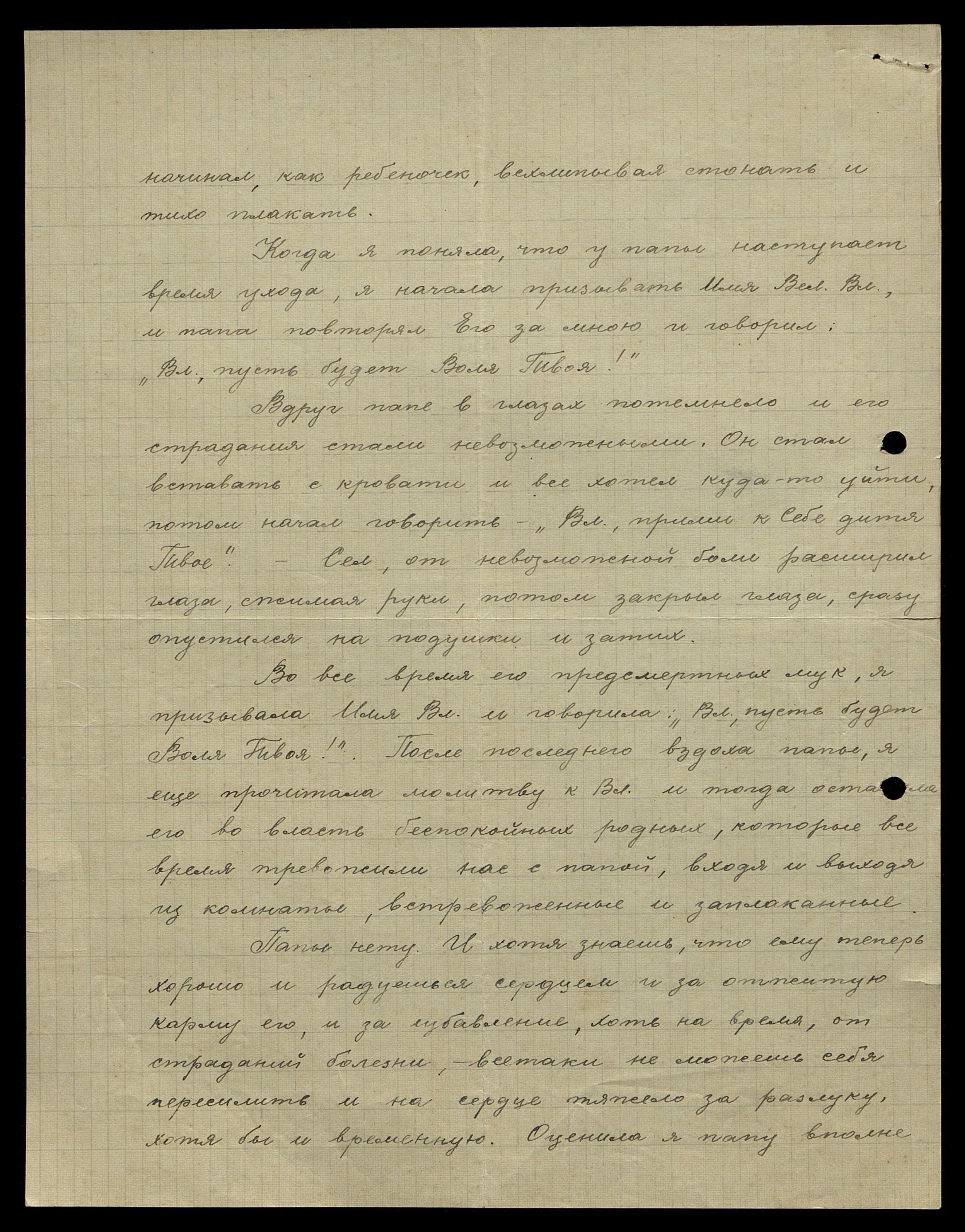 Когда я поняла, что у папы наступает время ухода, я начала призывать Имя Вел[икого] Вл[адыки], и папа повторял Его за мною и говорил: "Вл[адыка], пусть будет Воля Твоя!"