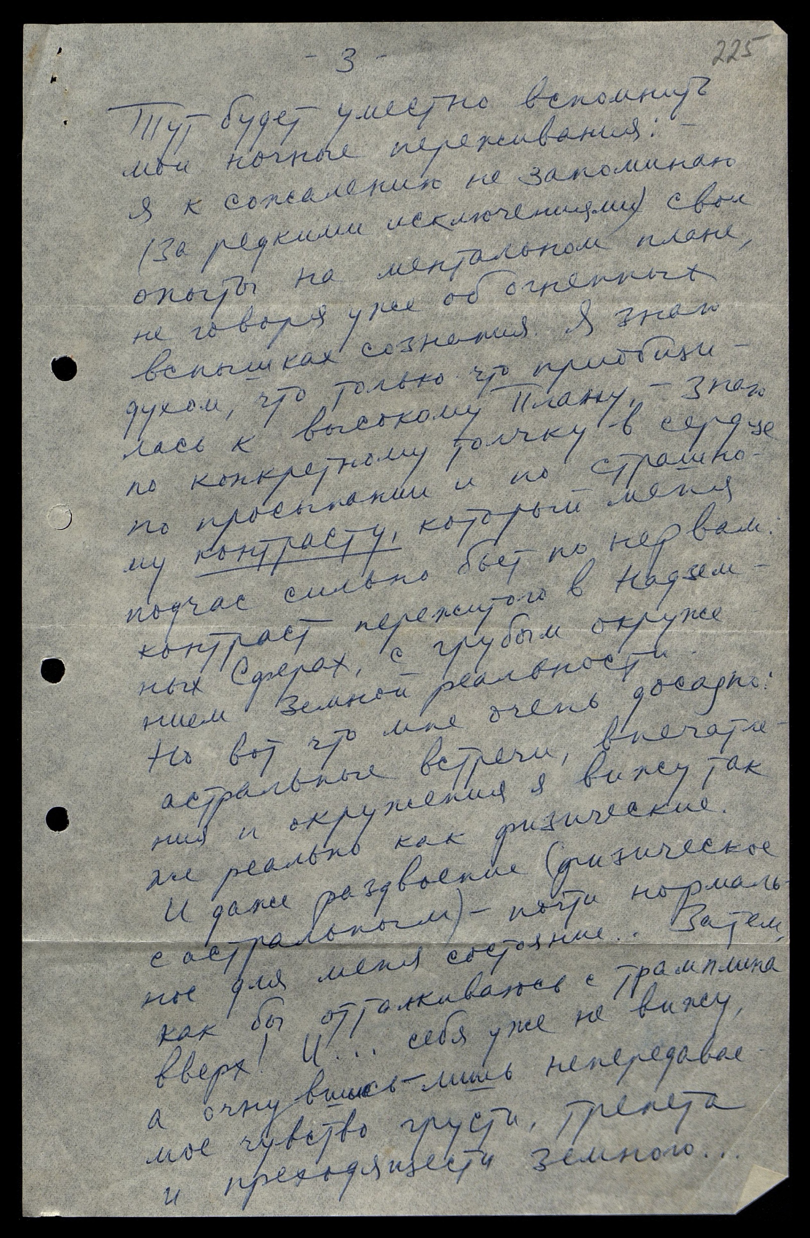 Тут будет уместно вспомнить мои ночные переживания: я, к сожалению, не запоминаю (за редкими исключениями) свои опыты на ментальном плане, не говоря уже об огненных вспышках сознания. Я знаю духом, что только что приобщилась к высокому Плану, — знаю по конкретному толчку в сердце по просыпании и по страшному контрасту, который меня, подчас, сильно бьёт по нервам: контраст пережитого в Надземных Сферах с грубым окружением Земной реальности. Но вот что мне очень досадно: астральные встречи, впечатления и окружения я вижу так же реально, как физические. И даже раздвоение (физическое с астральным) — почти нормальное для меня состояние… Затем, как бы отталкиваюсь с трамплина вверх! И… себя уже не вижу, а очнувшись — лишь непередаваемое чувство грусти, трепета и преходящести земного…