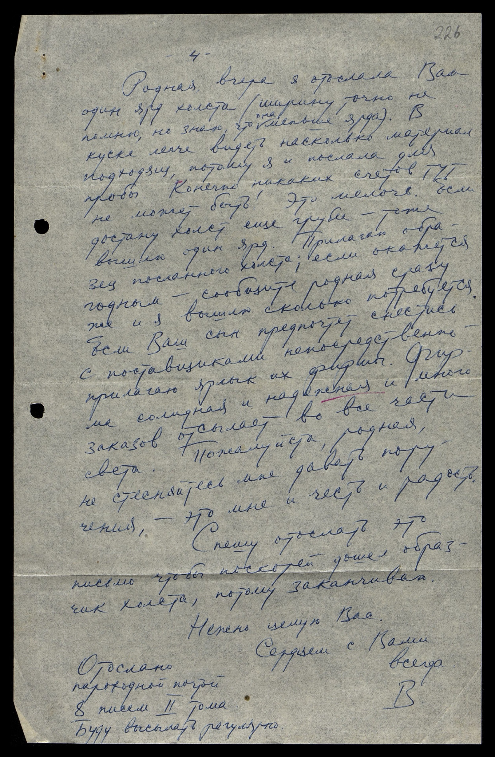 Родная, вчера я отослала Вам один ярд холста (ширину точно не помню, но знаю, что она меньше ярда). В куске легче видеть насколько материал подходящ, потому я и послала для пробы. Конечно, никаких счётов тут не может быть! Это мелочь. Если достану холст ещё грубее — тоже вышлю один ярд. Прилагаю образец посланного холста; если окажется годным — сообщите, родная, сразу же и я вышлю сколько потребуется. Если Ваш сын предпочтёт снестись с поставщиками непосредственно — прилагаю ярлык их фирмы. Фирма солидная и надёжная и много заказов отсылает во все части света. Пожалуйста, родная, не стесняйтесь мне давать поручения — это мне и честь, и радость.
